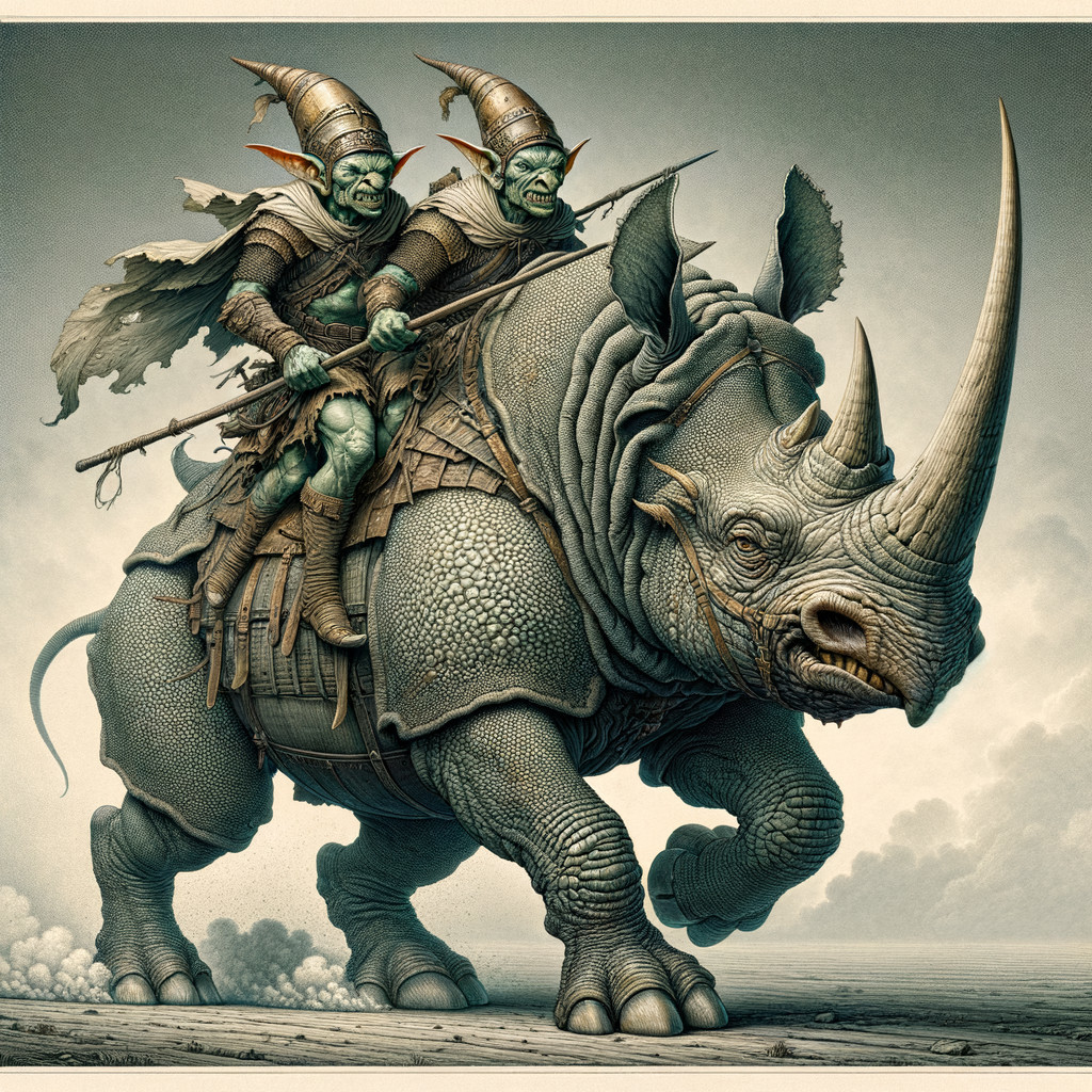 Armored fantasy characters on a rhinoceros in misty mountain setting