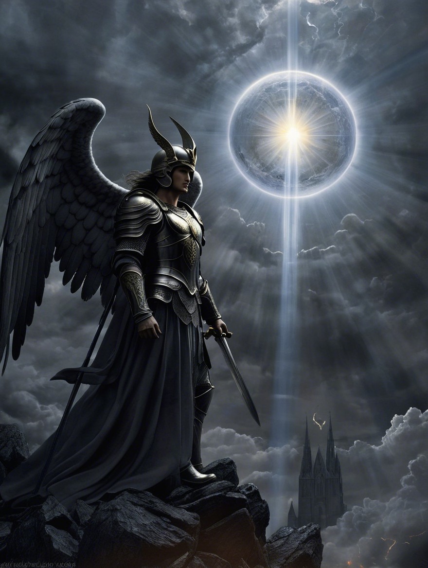 Cody's Eye Spiritually Discerned Prophetic Art- Archangel Michael defeats the UFO of False Light of satan.
