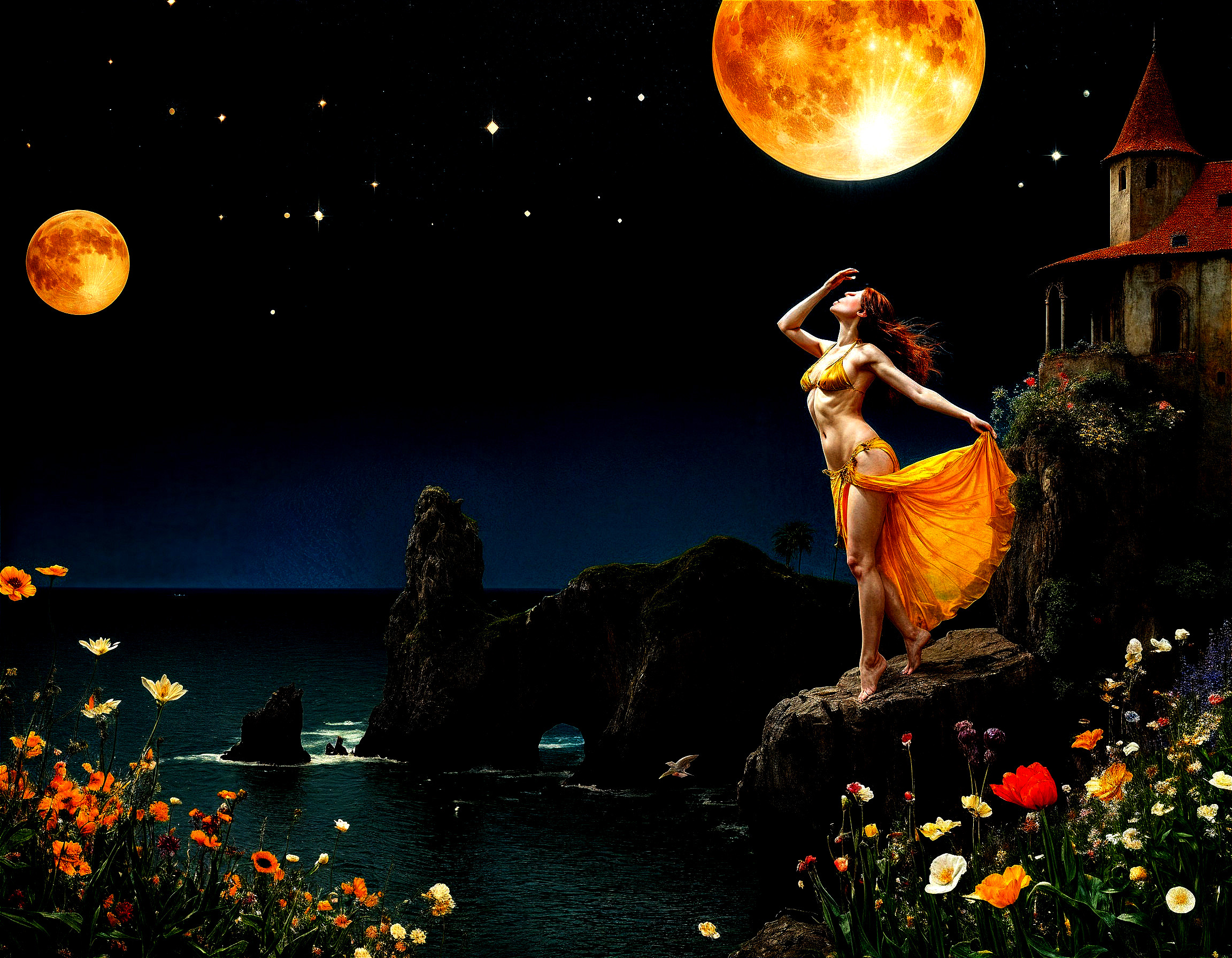 A stunning, hyper-realistic illustration features a beautiful woman dancing in a surreal moonlit landscape, adorned with vibrant flowers and unique birds, all in a richly detailed, dreamlike style.