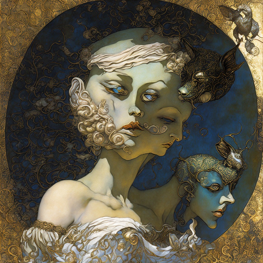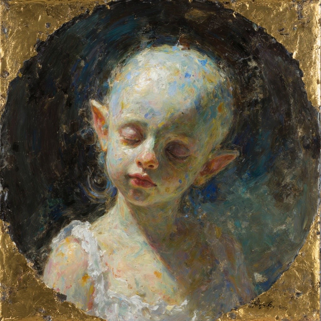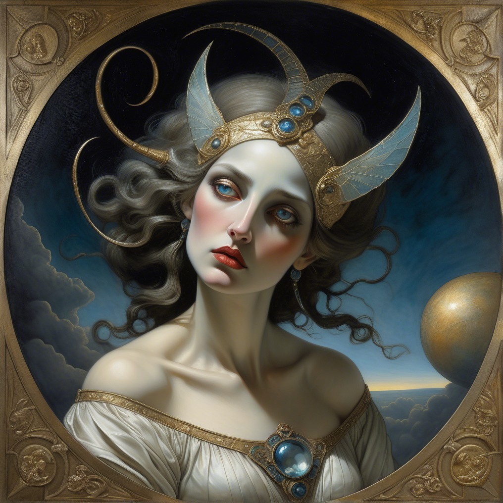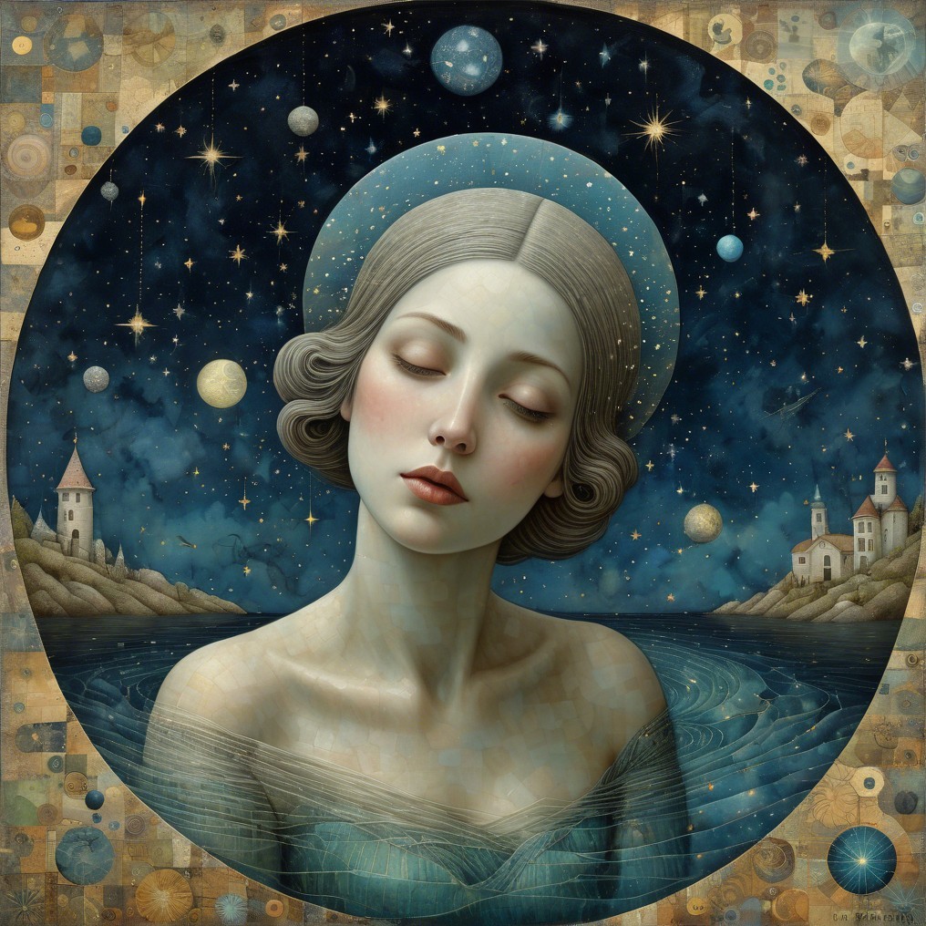 A serene woman emerges from swirling waters, surrounded by planets and a cosmic landscape. Ethereal castles and distant worlds are visible, blending fantasy with a dreamy, celestial atmosphere.