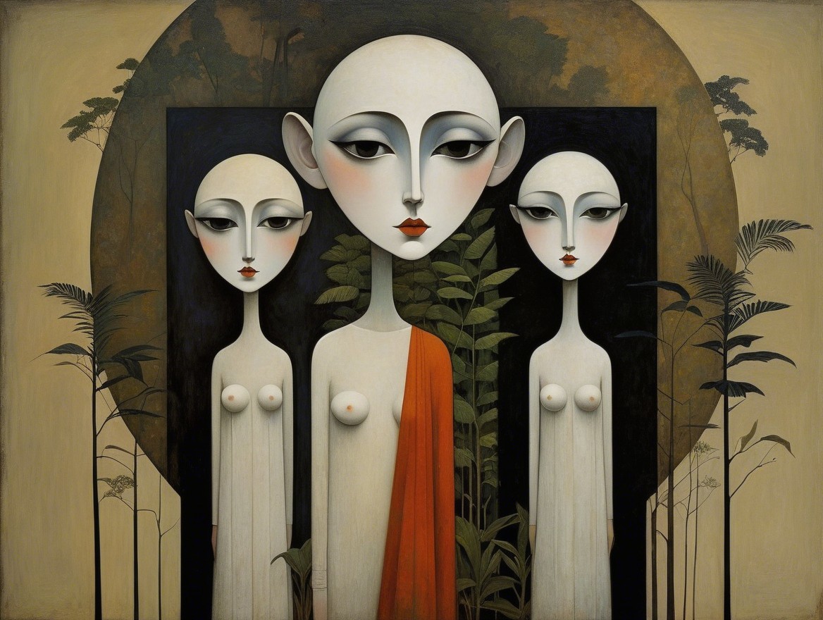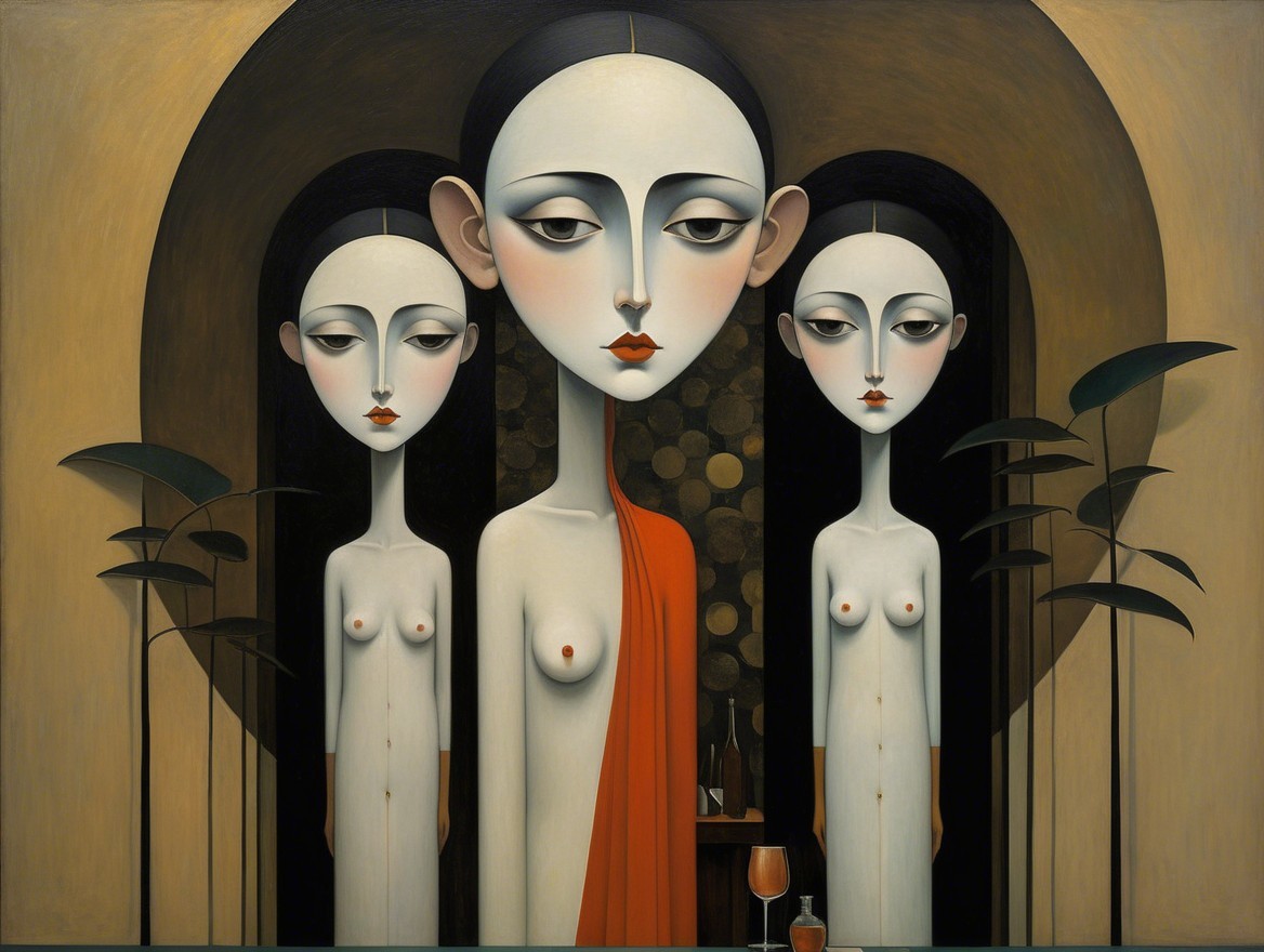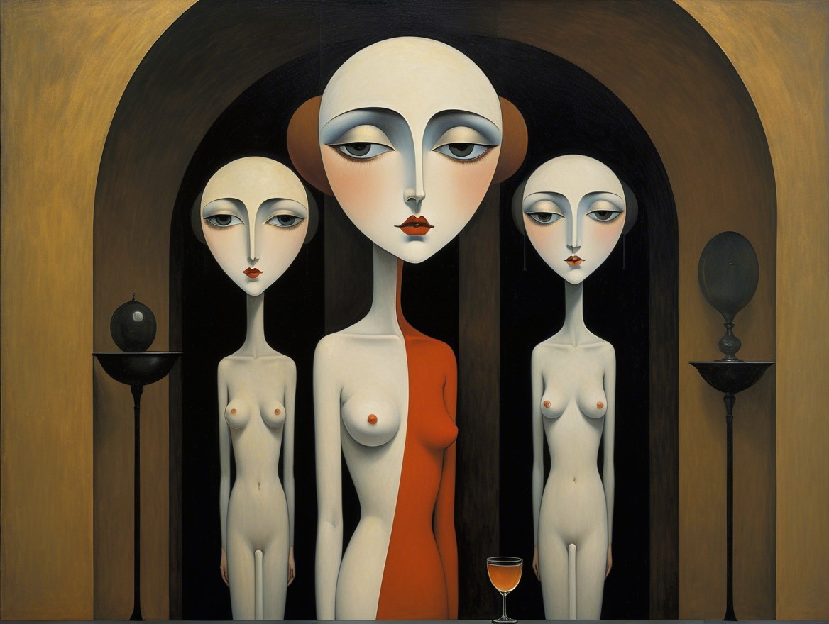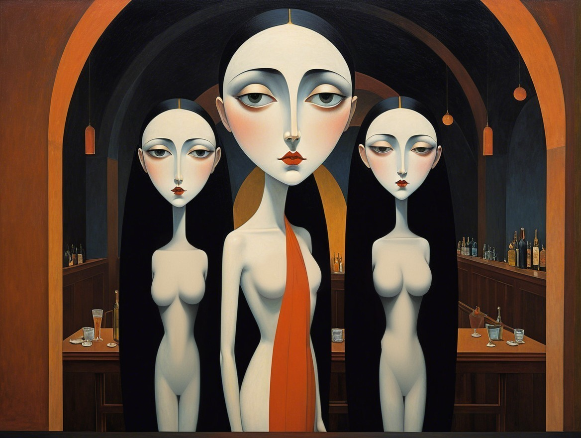A stylish couple stands at a glamorous bar, adorned with elegant lamps. The woman in a striking red dress captures attention, while the man in a tuxedo exudes sophistication, set against a vibrant backdrop.