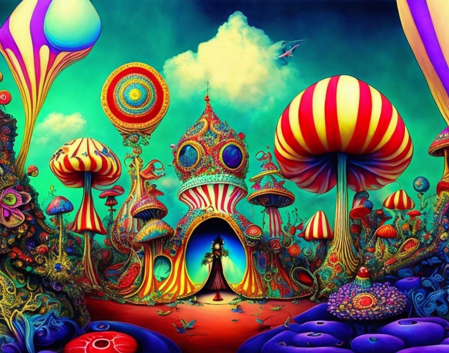 Alice in Wonderland with many magic mushrooms - artwork by Salvador Dali - style by Tim Burton - colorful, high definition, very detailed, high focus, very sharp