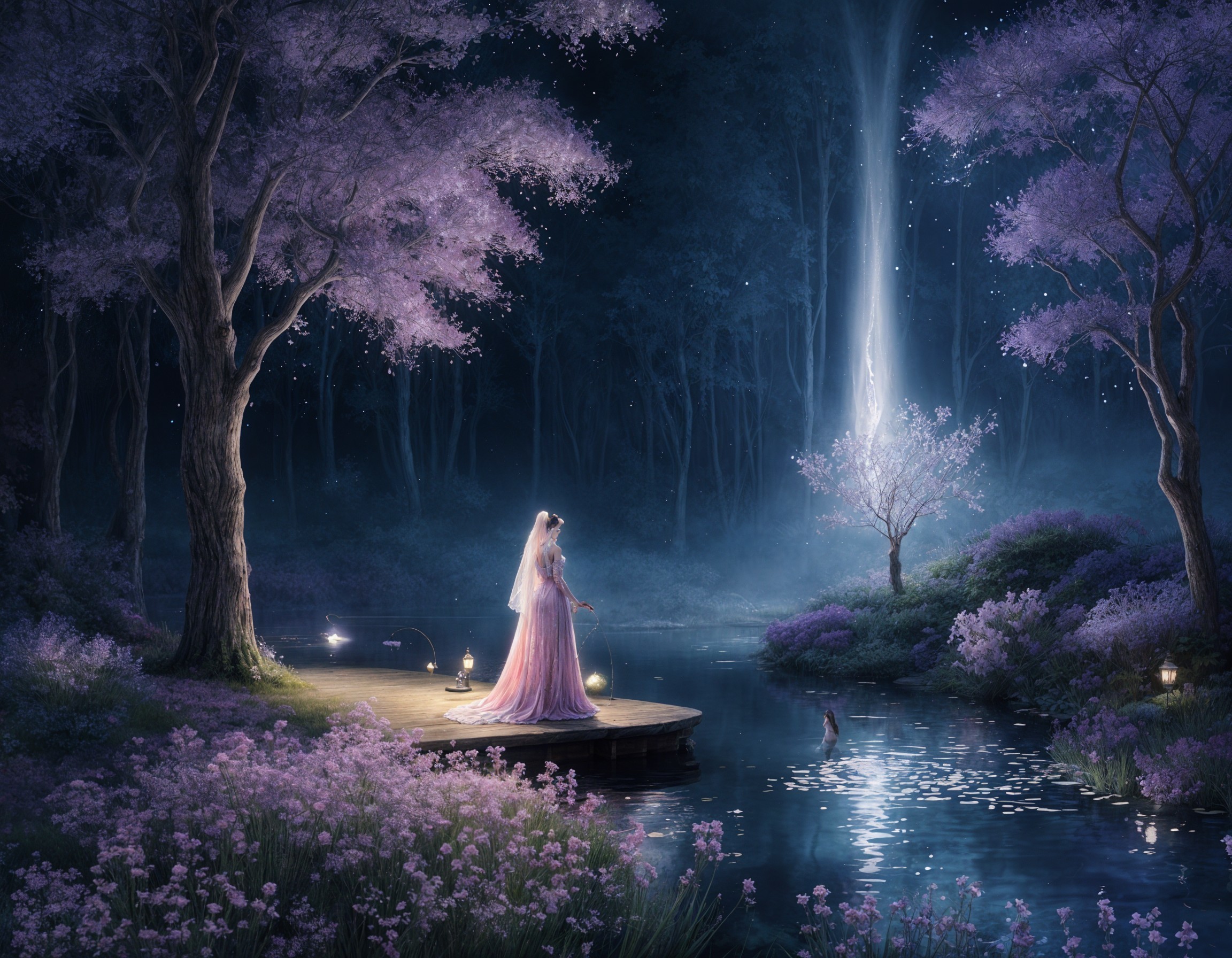 Prompt: "Moonlit night scene, woman on crescent moon, fishing in pond below, watercolor smudged baby's breath flowers, scattered roses, fluorescent moonlit trees, serene ambiance, mystical atmosphere, detailed fantasy illustration, dreamy and dramatic, surreal setting, tranquil waters, fishing rod in hand, peaceful expression, ethereal glow, enchanting color palette of blues, purples, and pinks, soft and glowing lighting, by a blend of Alphonse Mucha and Yoshitaka Amano, Artstation."