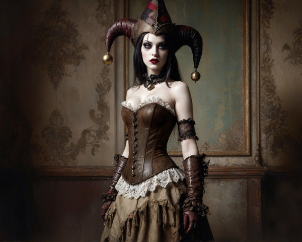A striking figure with pale skin and dark makeup, adorned with a floral crown and a skull. The dramatic contrast of colors and textures creates a haunting yet beautiful aura.