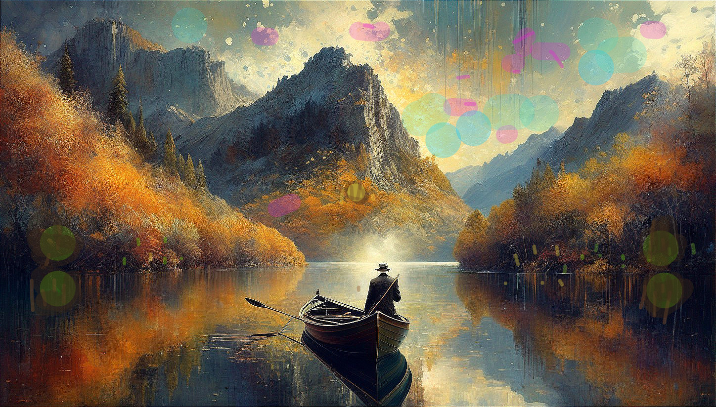 A person stands by a canoe on a calm lake, surrounded by mountains and autumn trees under a dramatic, painted sky.