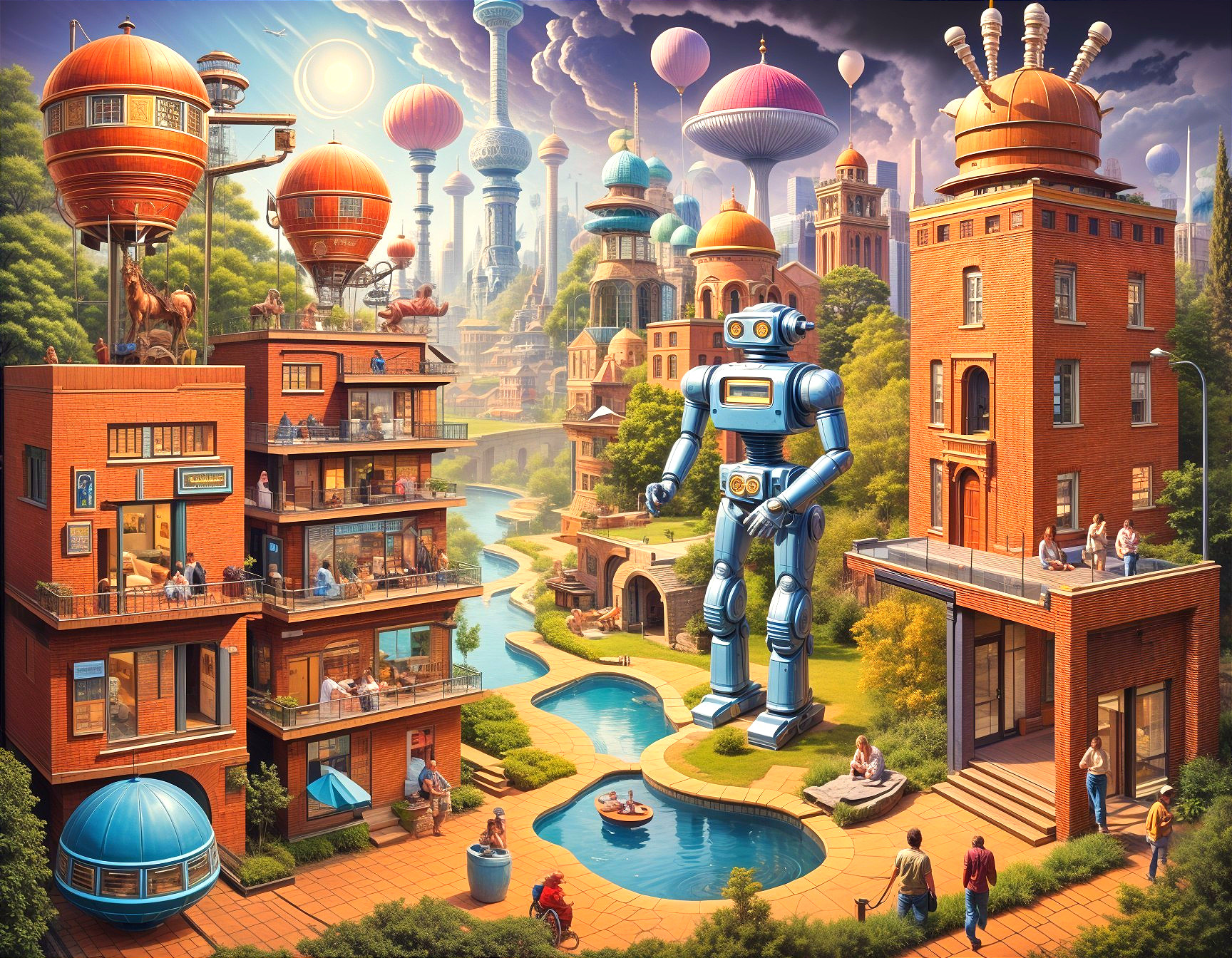 A metal robot constructs a unique AI factory to predict town moods based on weather. The surreal scene captivates the townspeople, with a blend of fantasy, magical realism, and vibrant colors, creating an intricate and ethereal atmosphere in a detailed and immersive 4K 3D setting.