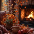 A cozy room features a warm fireplace, a vase of vibrant orange flowers, and bowls of shiny red apples on a wooden table, creating an inviting autumn atmosphere.