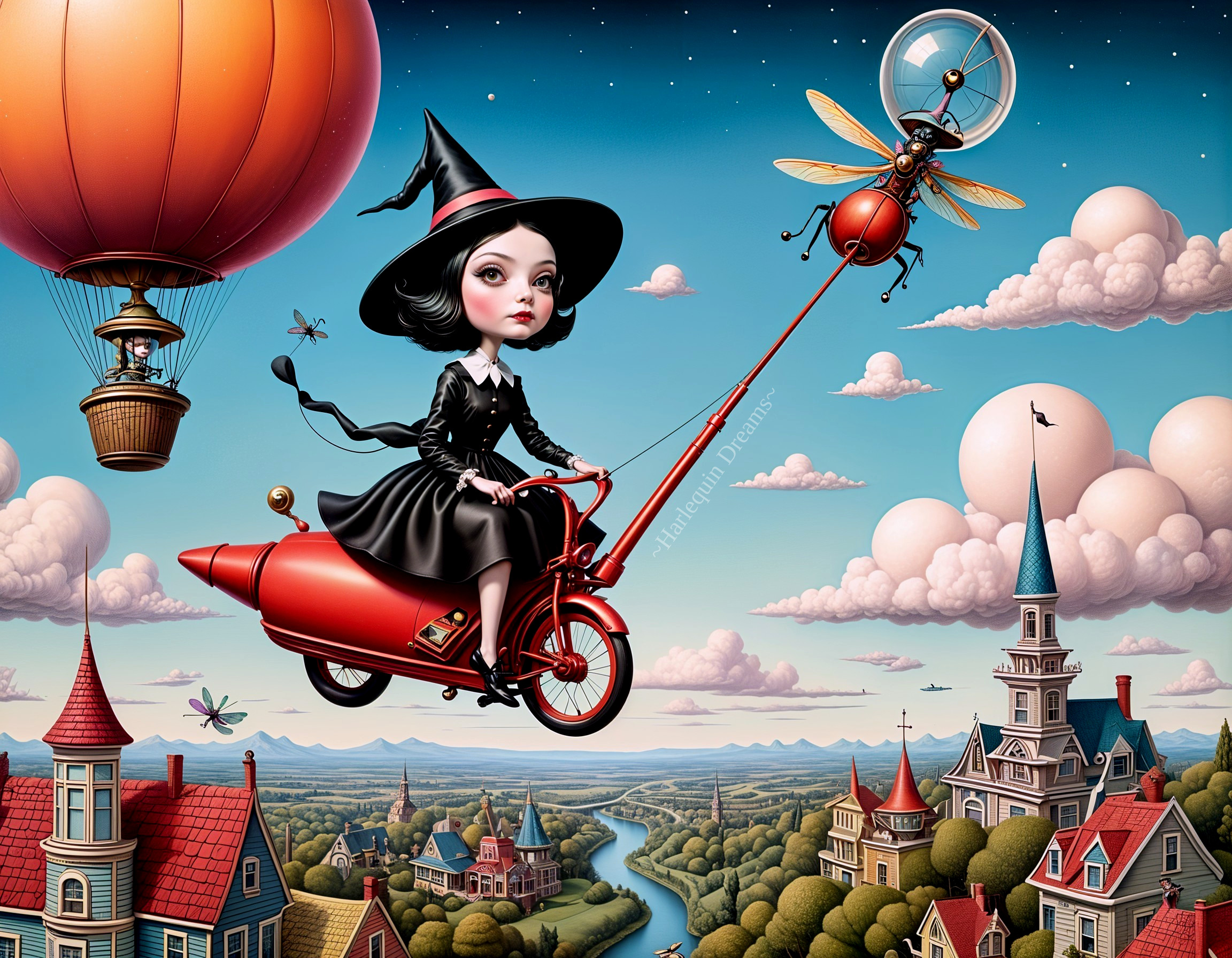 A whimsical scene featuring a young girl in a witch's hat riding a rocket-like bike, soaring over charming houses and a river, with hot air balloons and insects in a vibrant, dreamlike sky.