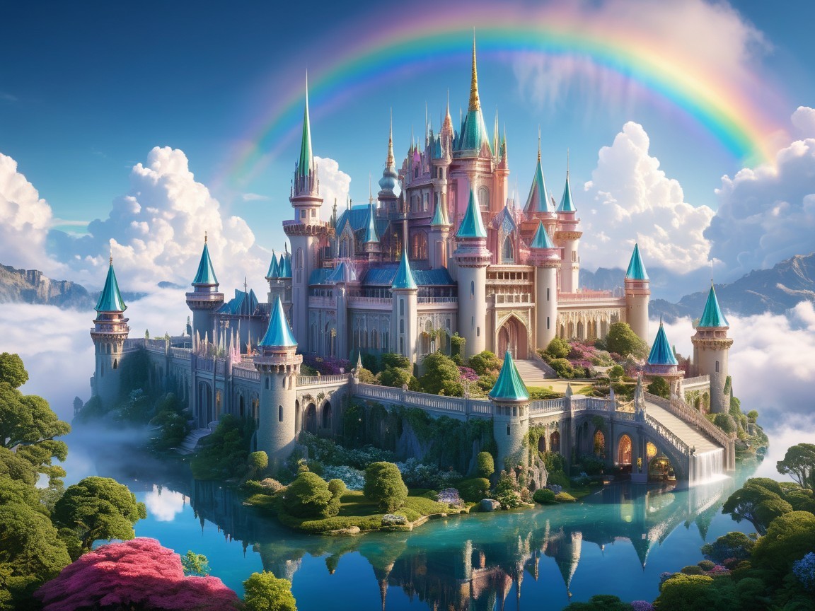 A majestic castle with colorful towers and spires stands atop a lush island, surrounded by vibrant flowers and reflecting waters, under a bright sky adorned with multiple rainbows.