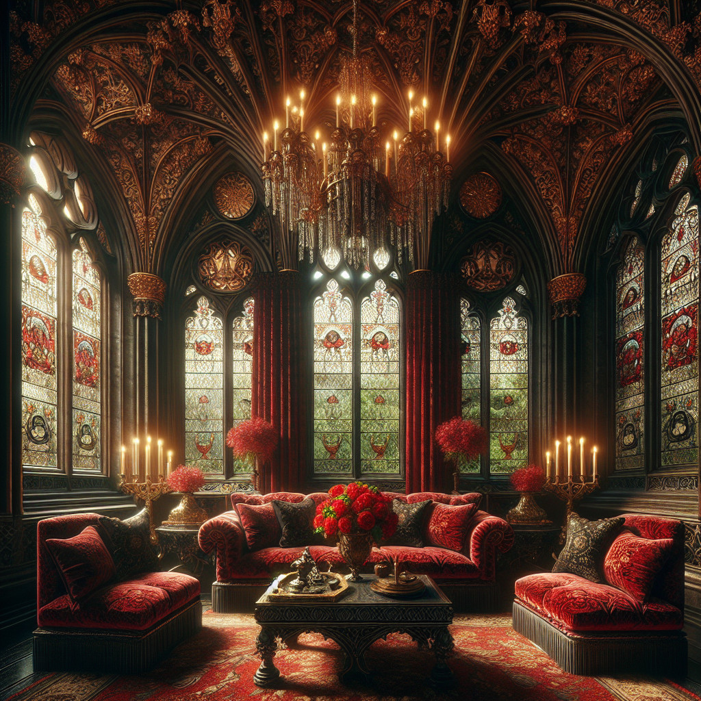 Prompt: "Create an image of a luxurious Gothic interior room with tall, intricate stained-glass windows featuring designs reminiscent of medieval architecture. The walls are painted in deep, rich colors, predominantly black, enhancing the dramatic atmosphere. In the center, place an elegant, plush red sofa with ornate golden detailing, flanked by two matching armchairs. Each chair is upholstered in the same deep red fabric, providing a cozy yet opulent vibe.