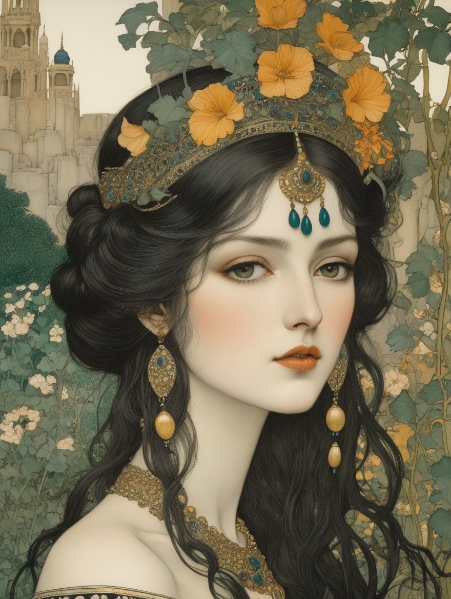 elegant fantasy intricate very attractive beautiful fantastic view hyperrealistic ultra detailed crisp quality watercolor Arthur Rackham Gustav Klimt pen and ink anatomically correct Aubrey Beardsley Kamal al-Din Bihzad Ella du Cane 3rd century Persian miniature art