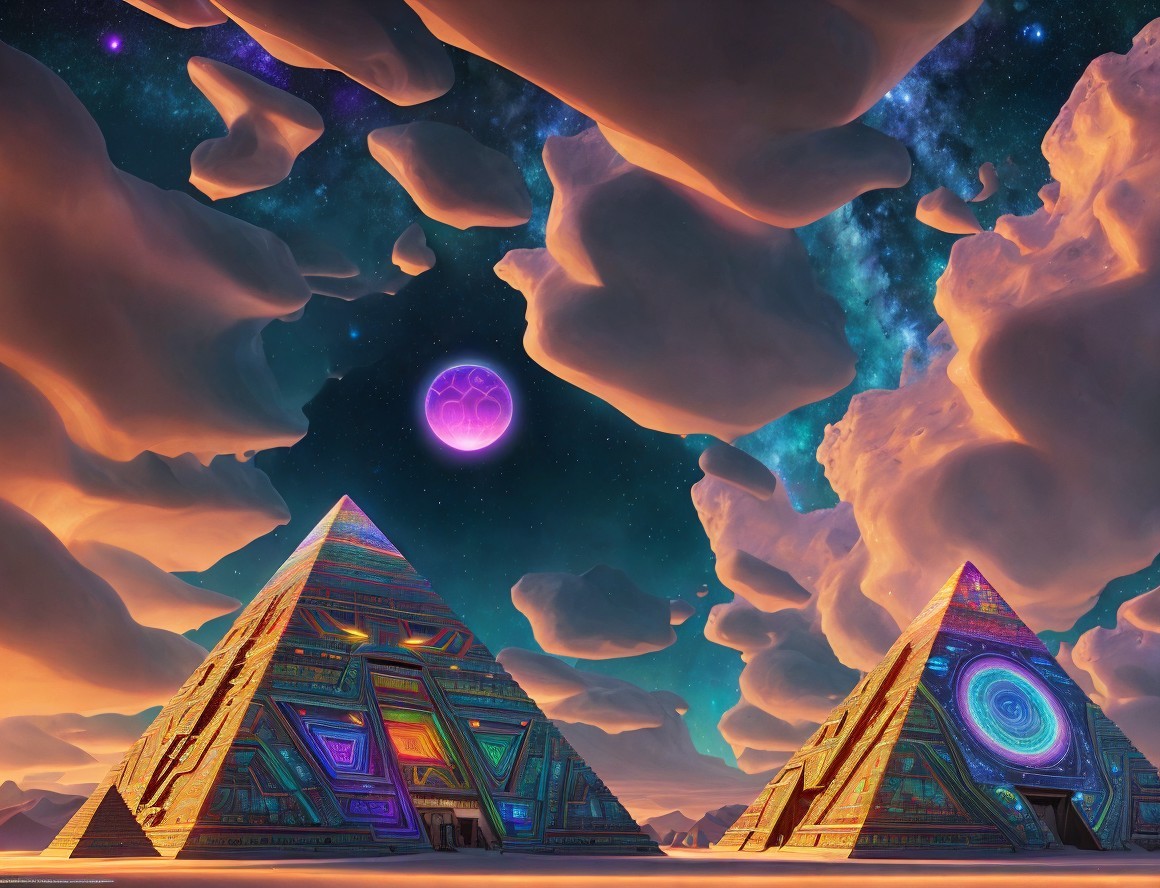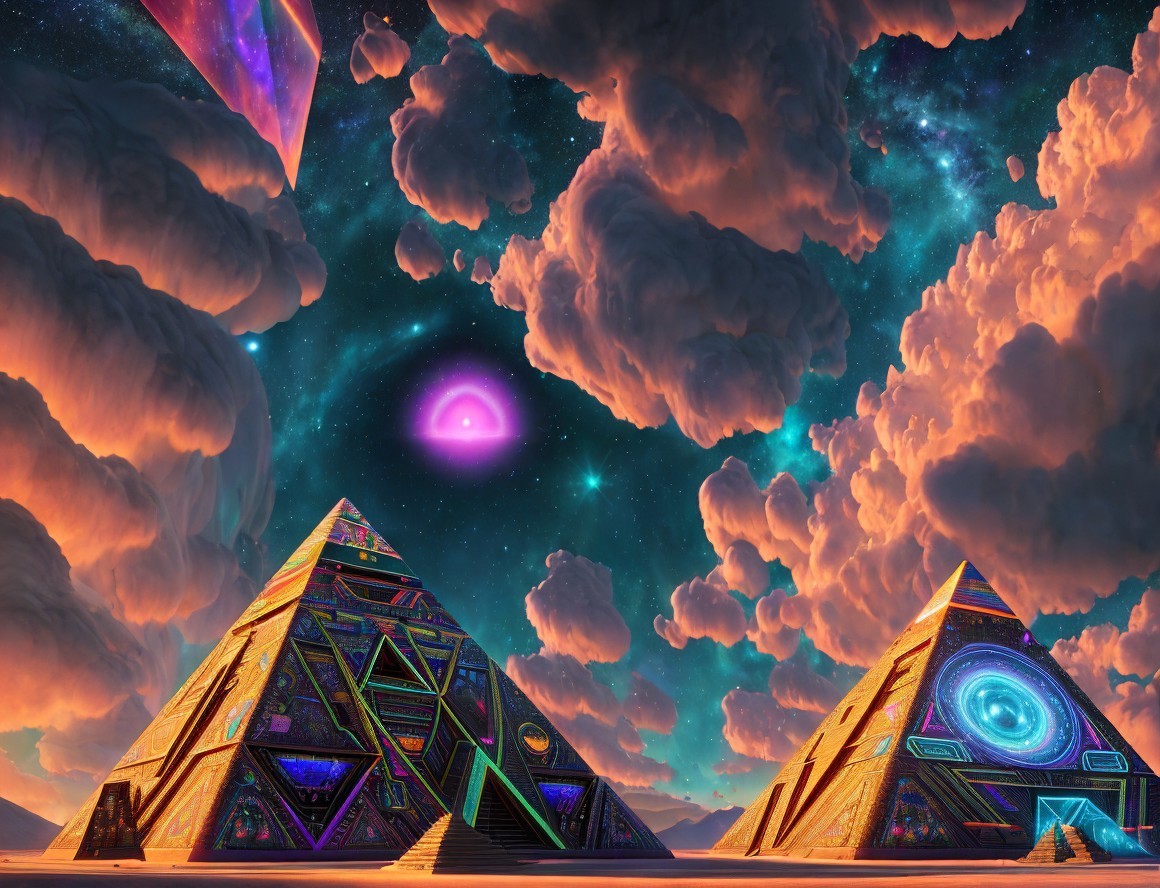 + Prompt:Interdimensional portal on an advanced alien planet. At the base of the portal is a pyramid with intricate geometric patterns. psychedelic visionary art, transcendence art, shamanic DMT realm, sacred geometric patterns, galactic DMT world. Advanced alien technology