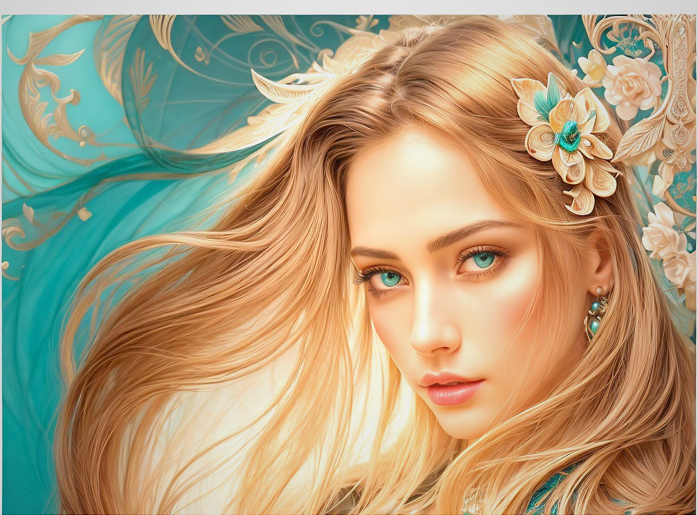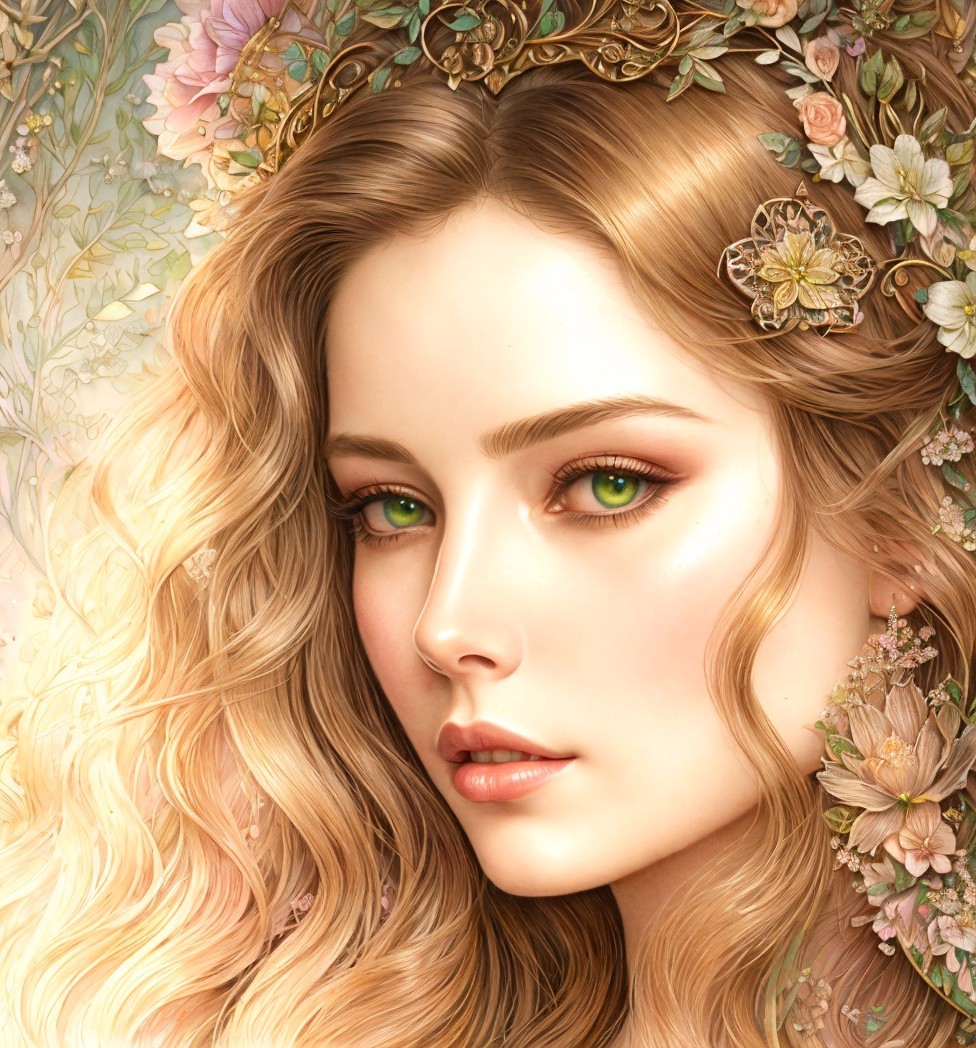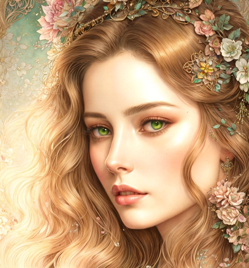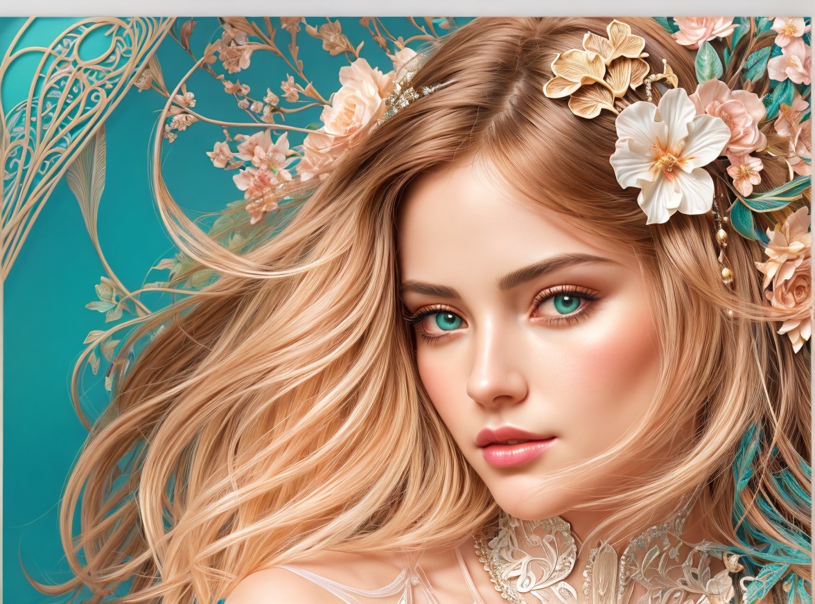 Portraiture in style of realistic hyper-detailed rendering, fauvistic cuts, delicate hairstyle, hues, art nouveau illustration, glossy, close-up portrait, wavy --ar 4:5 --style raw. Vintage Fairytale inspired. Watercolour, pen and ink, tetradic color scheme Emerald brown ochre beige, highly coloured illustration, Colored line drawing, Intense and mysterious aura, portraiture, beautiful female enchantress in edwardian blouse with crackles, crochets, headshot in style of Georgia O'Keeffe and Didier Lourenço, realistic devilish eyes, dynamic lighting 1.7, hues, watercolor and ink intertwined with anthotype print, grunge, style of Waterhouse, Arlie Opal, Carne Griffiths, Minjae Lee, Ana Paula Hoppe, Stylized watercolor details, intricate ,meticulously, muted coloring, detailed close-up portrait, stylized face, watery alcoholic painture with dots and flares and splashes, soft rounded edges, back-lit, tetradic color scheme lilac beige blue purple, blue lighting, wavery paint, style of paint dripping technique, wet on wet painting, gothical futurism, chiaroscuro lighting, ambient occlusion 1.5, shadow mapping 1.3, 3d effects 1.8, intricate stylized hairstyle, brightness 1.7, stylized zentangle lines, abstract, coherent, otherworldly psychpomp, occult, Anglo gothic 1.9, auracore, high coloring 1.9, traumacore 1.2, retrofuturistic details of ornate, maximalism, radiance, brightness 1.4, silver particles, dreamy glow, tints of abstract art nouveau illustration, 3d effects 1.8, shadow mapping 1.3, dynamic lighting 1.7, ambient occlusion 1.5, anisotropic filtering 1.9, raytraced shadows, ethereal, otherworldly, ambiance is gloomy and macabre. Hues, vintage fantasy, macabre, magical place, unique, quaint, evocative, Geof Darrow style. Inspired by fantasy movie poster art,