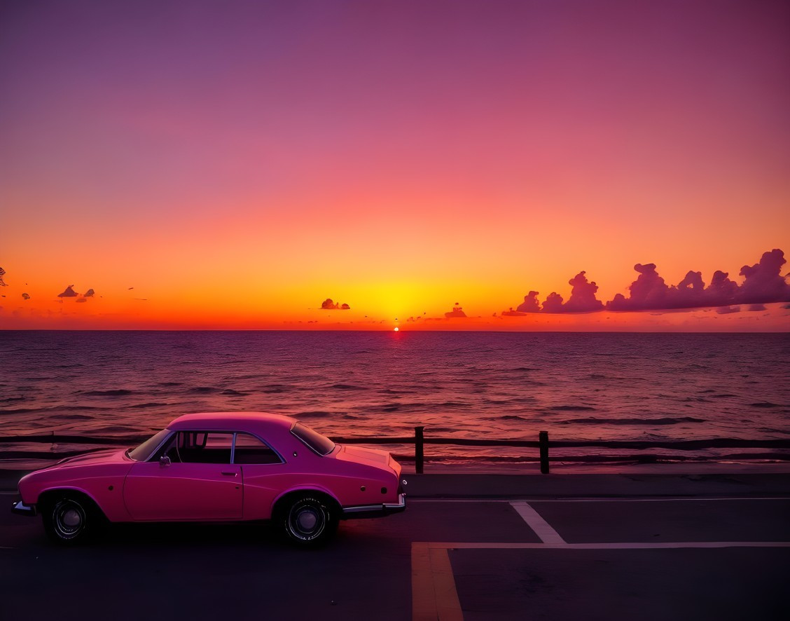 Vintage pink car parked by a beach at sunset with a vibrant sky and silhouetted palm trees.