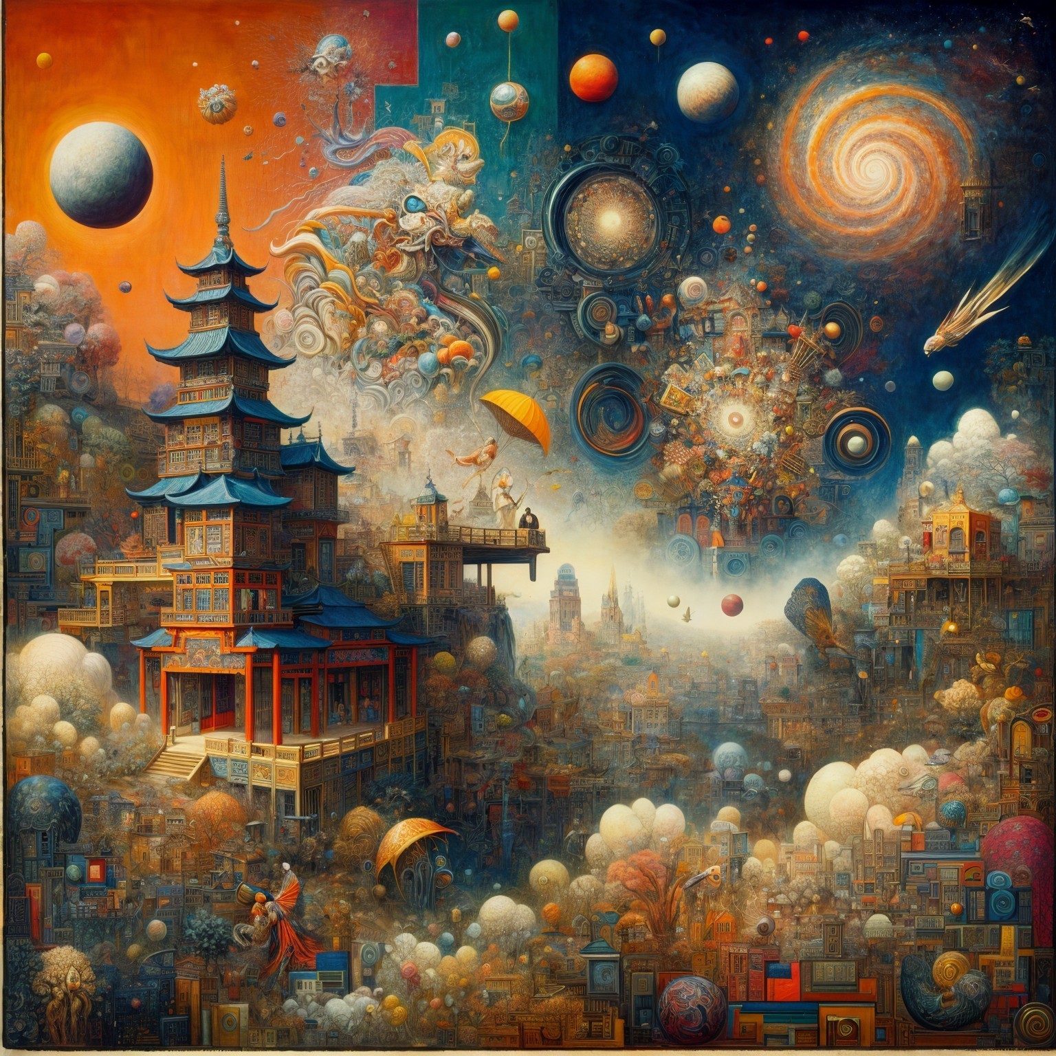 A whimsical landscape features a serene path leading to a floating castle surrounded by colorful hot air balloons. Lush greenery, a tranquil river, and figures add charm to the dreamy setting.