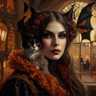 + Prompt:FIRST AUTUMN evening lights in the old ancient courtyard interior, extravagant, elaborate scary Halloween costume party, bats, black cat, spider webs, in the style of Wolfe Von Lenkiewicz ,style klimt e Van Gogh