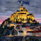 A majestic castle sits atop a rocky hill, illuminated against a twilight sky. Surrounding buildings dot the landscape, while clouds and stars add to the enchanting atmosphere of the scene.