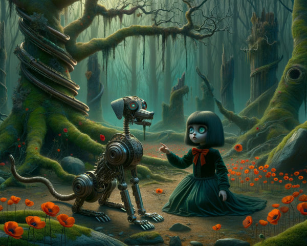 A woman with pink hair and striking makeup wearing a floral blue dress against a floral patterned background.