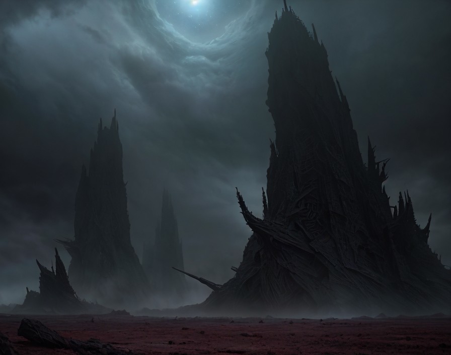 A dark, ominous landscape features towering, jagged peaks silhouetted against a misty, moonlit sky, with a blood-red ground and a mysterious, eerie atmosphere.