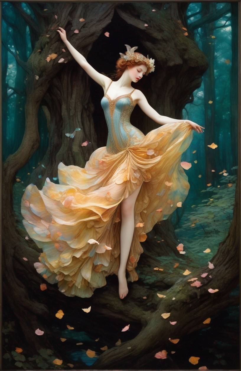 + Prompt:Beautiful fauns and nymphs, wearing flowing gowns made of flower petals, playing in a beautiful forest. Iridescent watercolor and ink By Jamie Heiden, Daniel Merriam, Paul Klee, Karol Bak, Dee Nickerson, extremely detailed, high definition, crisp quality, ultra detailed background art nouveau