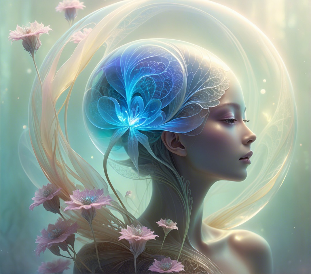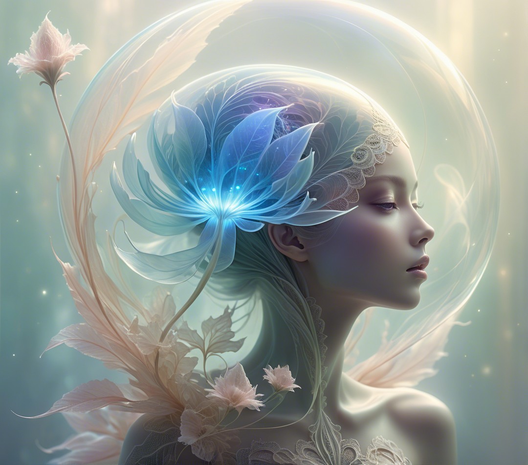 A serene, ethereal figure with flowing, delicate features adorned with a large, luminous lotus flower. Soft colors and light create a tranquil, dreamlike atmosphere, blending nature and beauty.