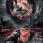 Cloaked Figure on Raven Statue in Mystical Landscape