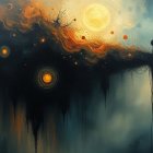 An abstract cosmic scene featuring swirling clouds of orange and dark hues, dotted with luminous planets and stars, evoking a sense of wonder and the vastness of the universe.