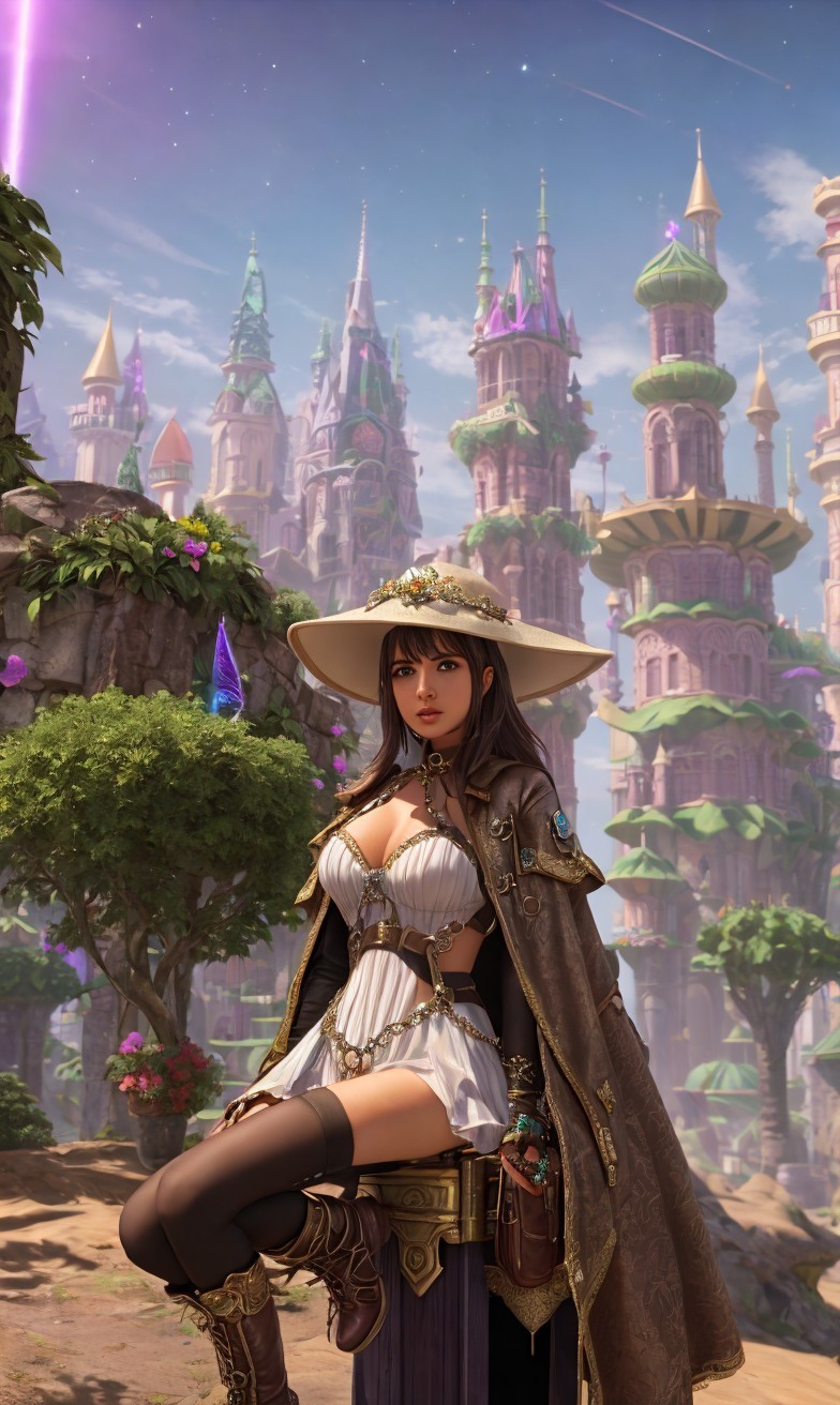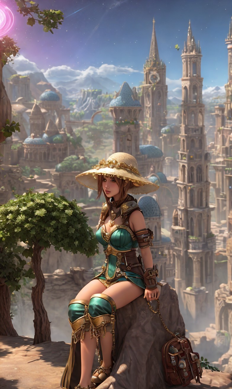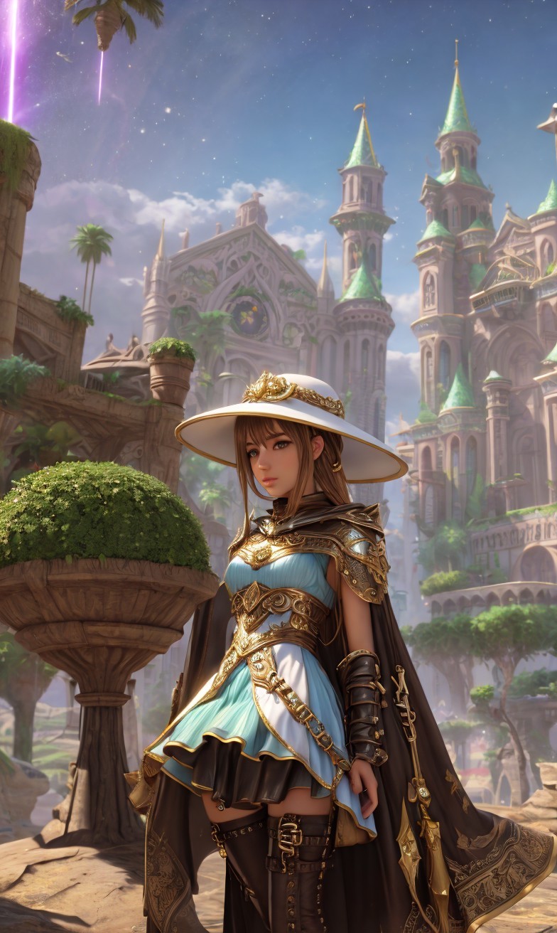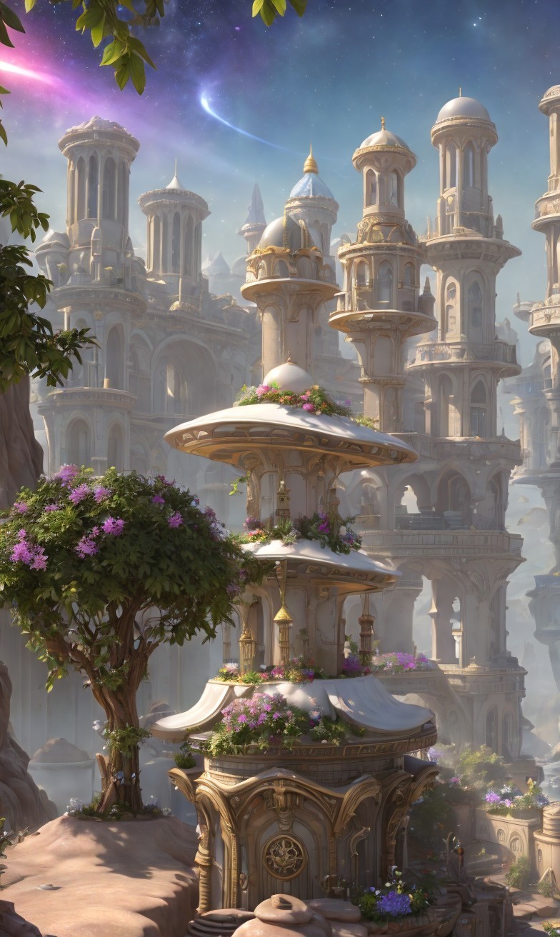 A futuristic cityscape with ornate, golden towers and floating structures. Lush greenery contrasts with the shimmering architecture, while a cosmic scene with planets looms in the sky above.
