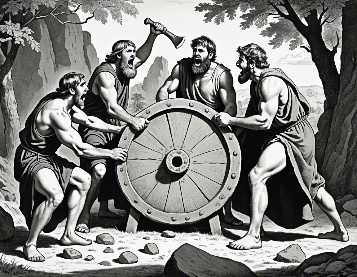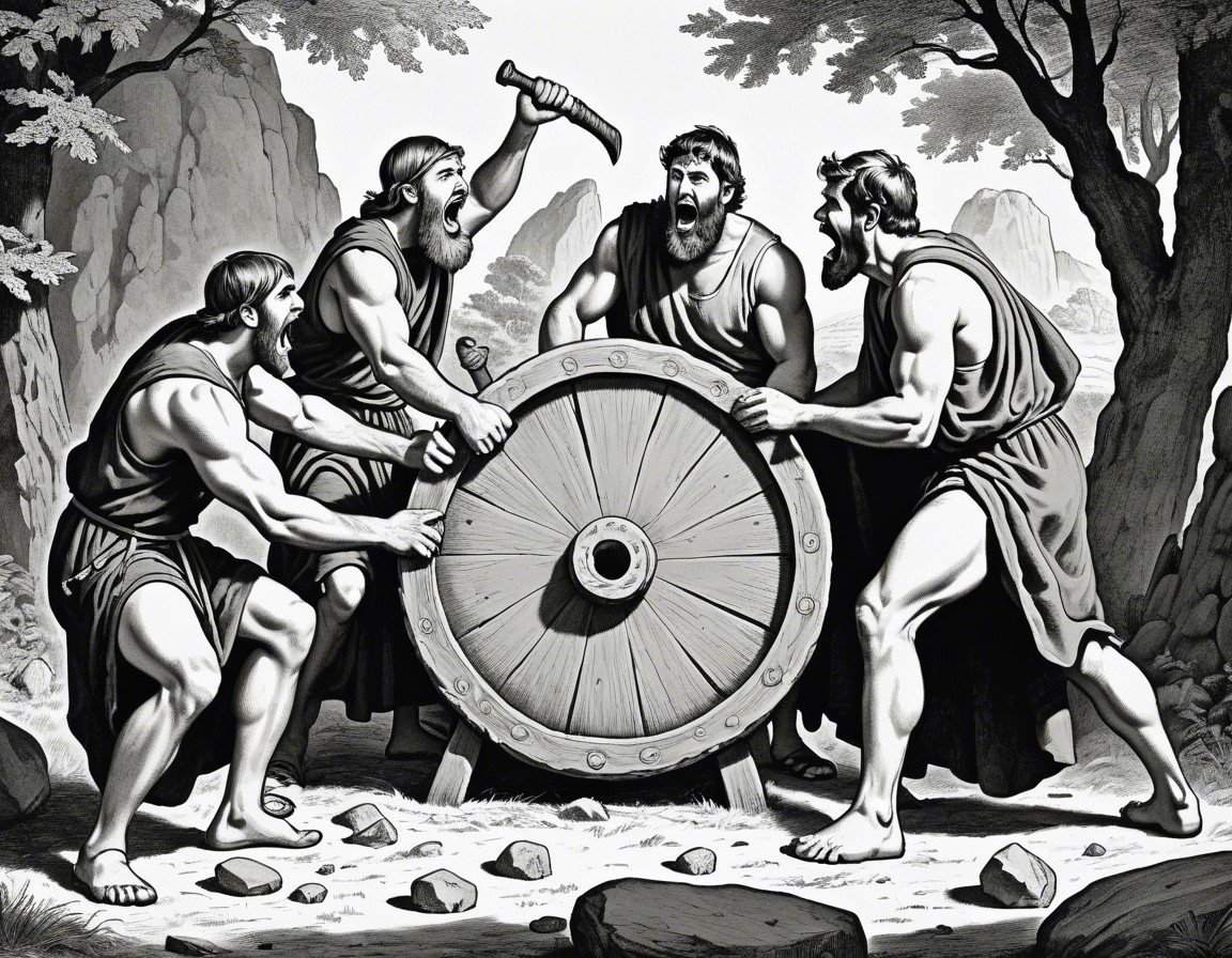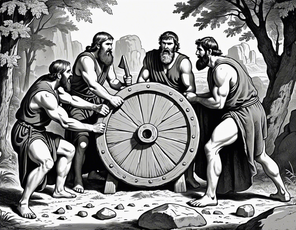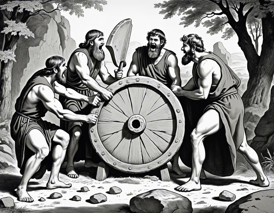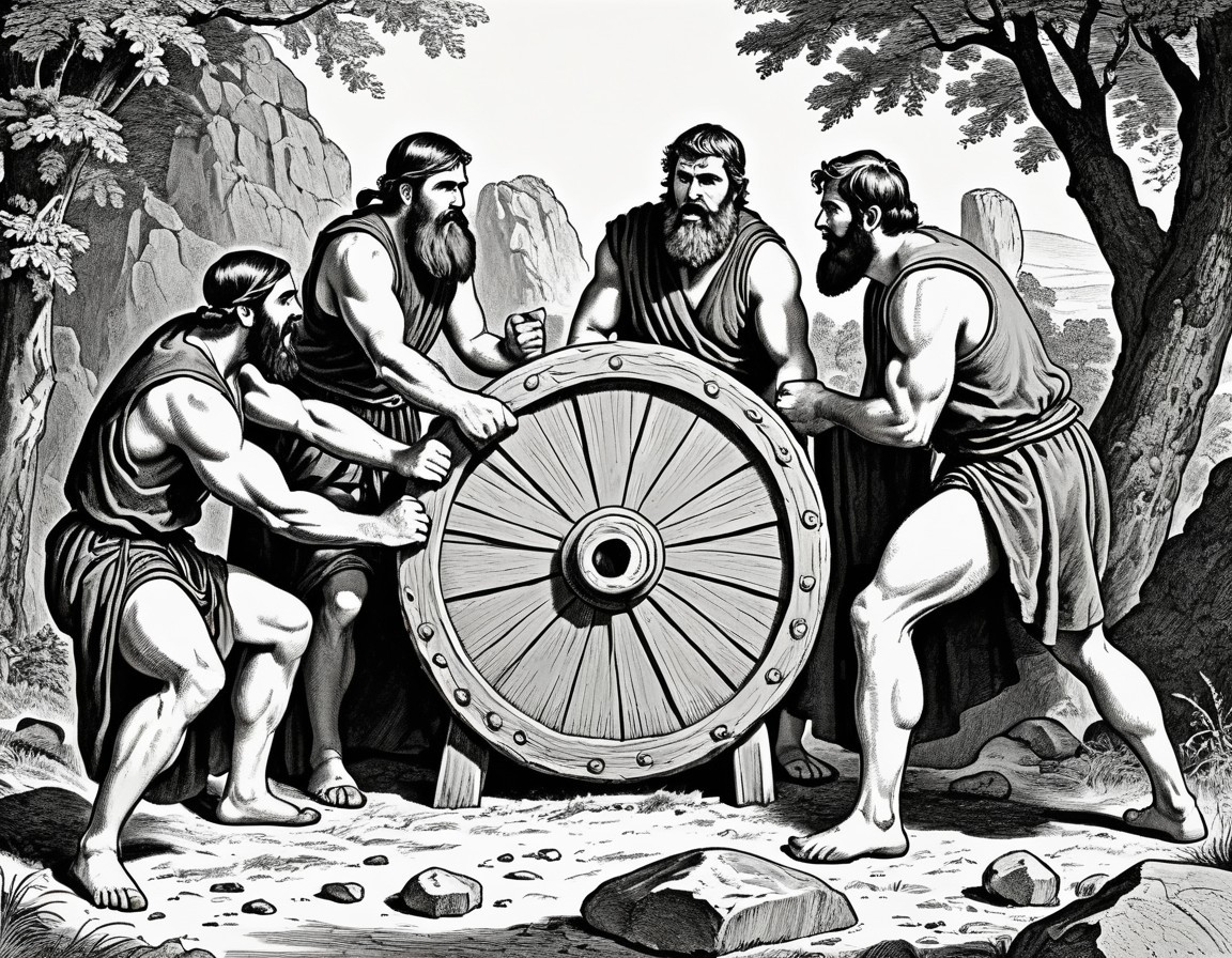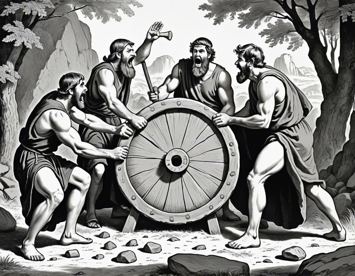 Four ancient Greek men with a chariot wheel, one pointing and giving orders, others listening attentively in a rocky landscape.