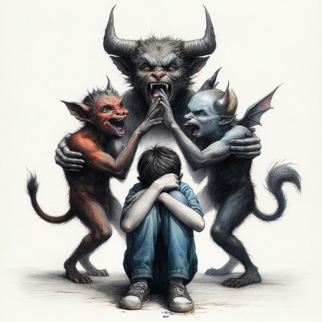 A young boy sits frightened, surrounded by three monstrous figures: a large, fierce creature and two smaller demons, one red and one blue, all conveying a sense of chaos and intimidation.