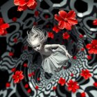 A delicate doll-like figure in a soft green dress floats amidst swirling gray forms and vibrant red flowers, conveying an ethereal and dreamlike atmosphere in a surreal setting.