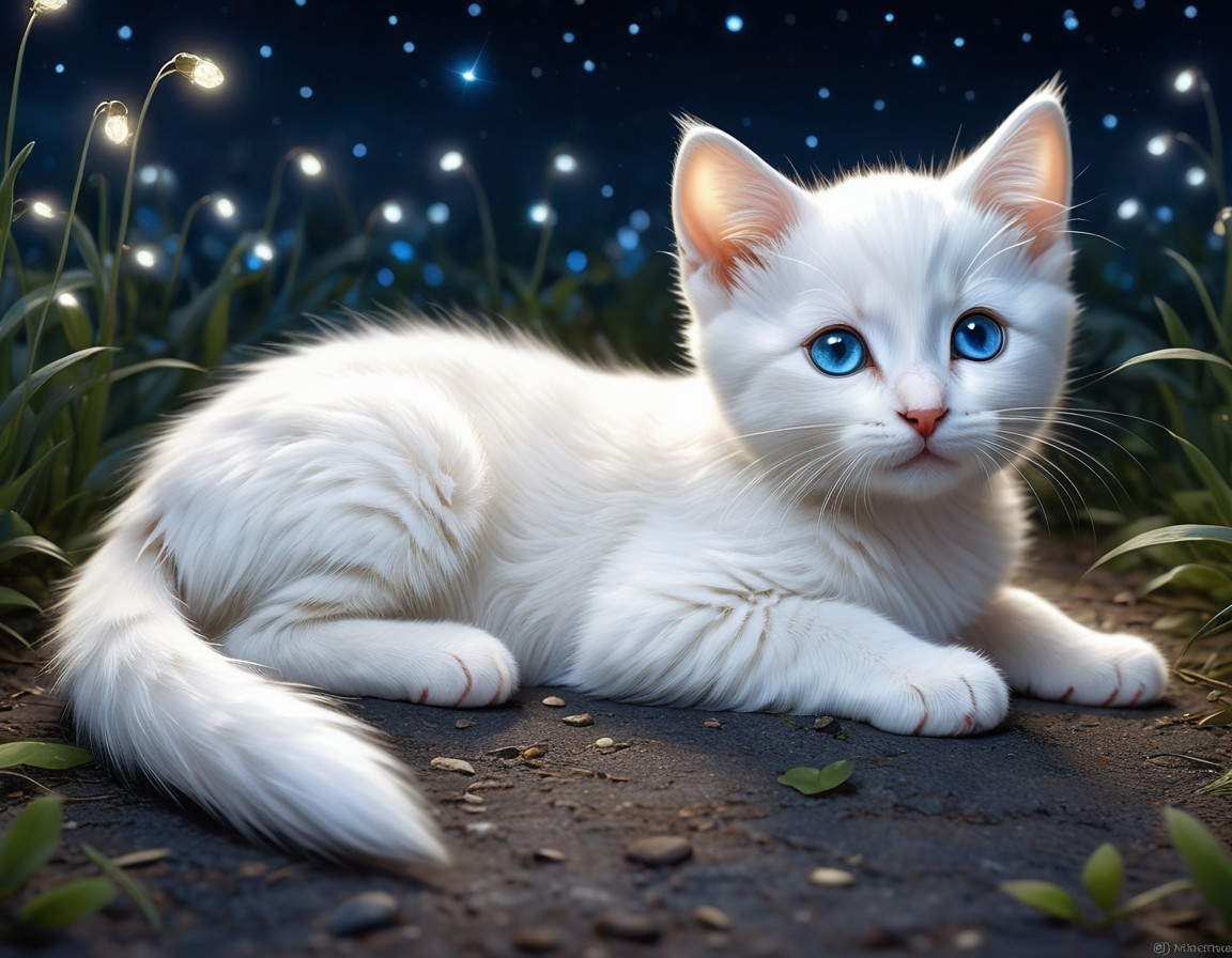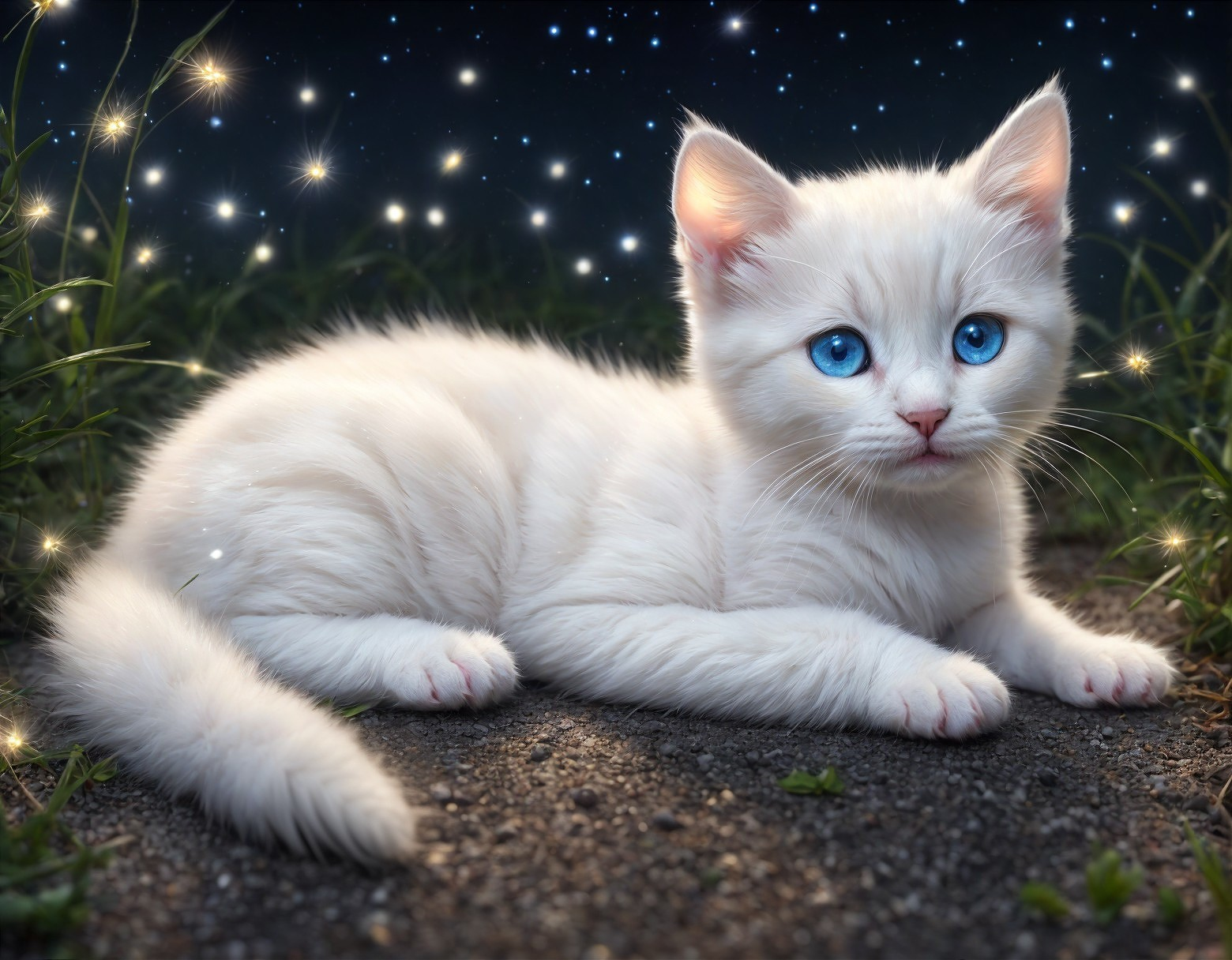 ("Try" from Crystal) - A cute, fluffy white kitten with striking blue eyes lies on a pathway. Sparkling stars surround it, enhancing the enchanting atmosphere of the night. Its fur looks soft and inviting.