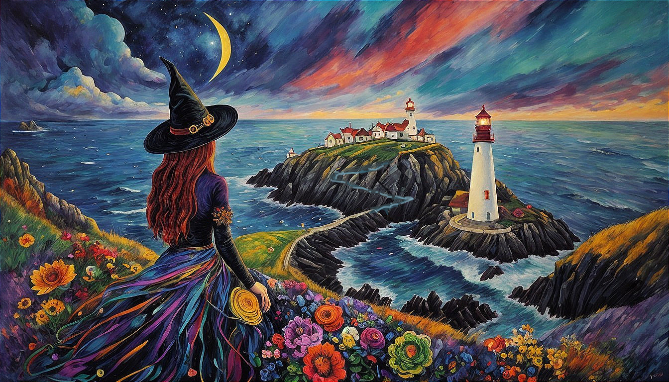 A witch gazes at a lighthouse on a cliff amidst a vibrant twilight sky and sea, with floral accents in the foreground.