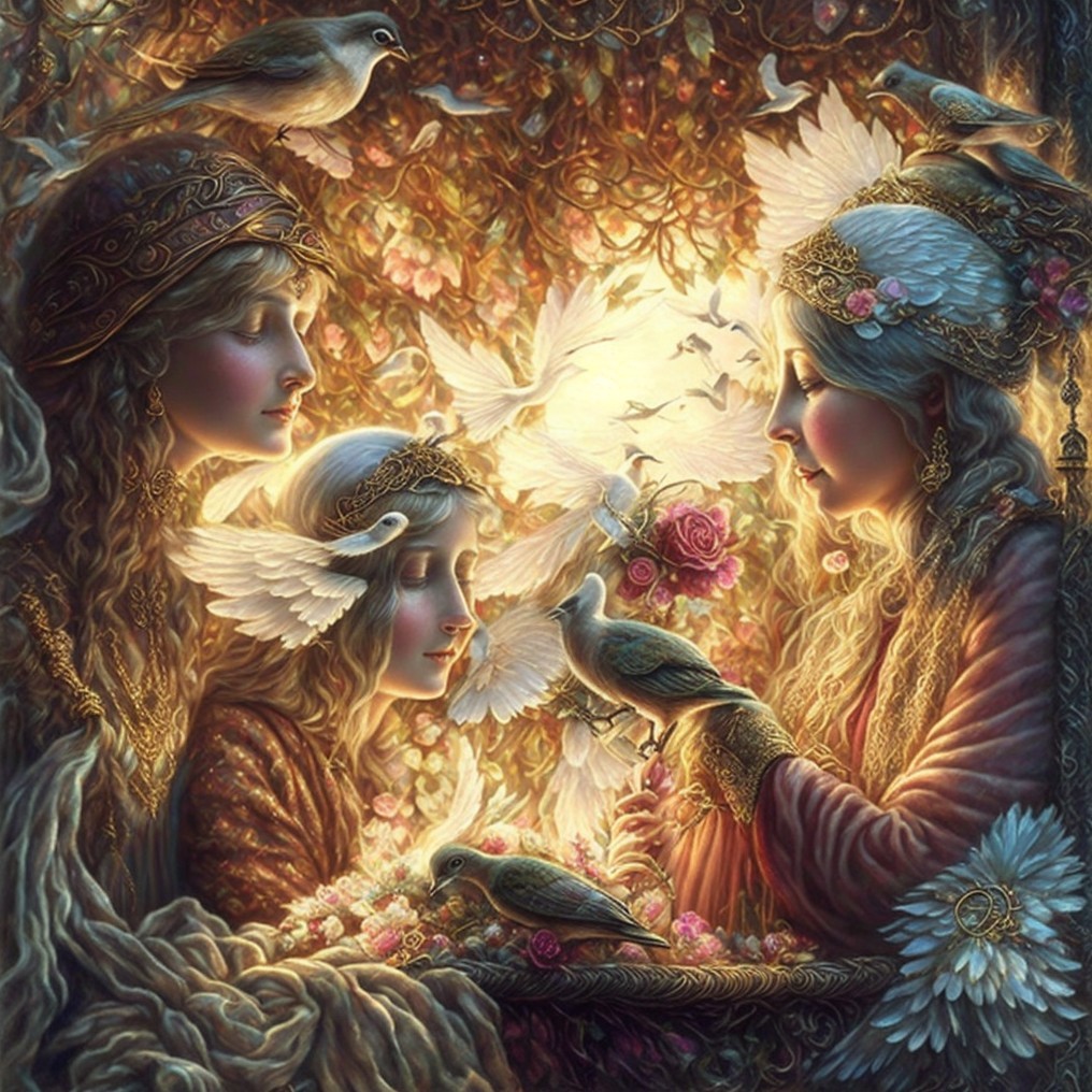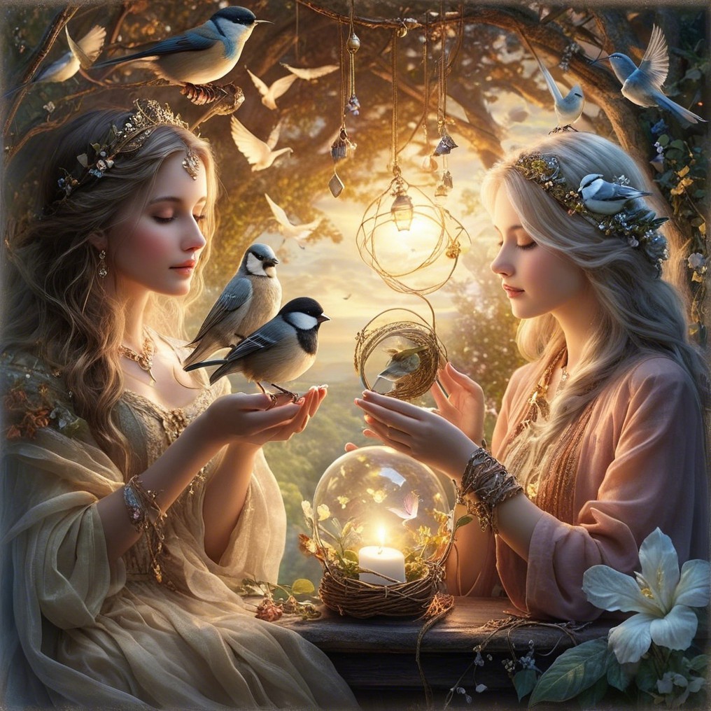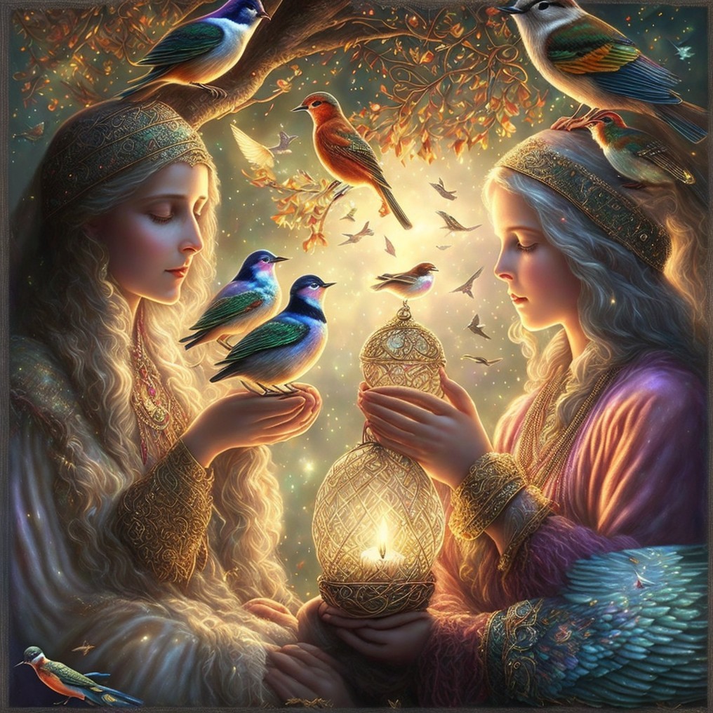 Two ethereal women, dressed in flowing gowns, gently hold birds while surrounded by a magical forest. A glowing lantern illuminates the scene, enhancing the serene, enchanting atmosphere.