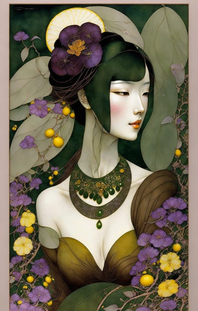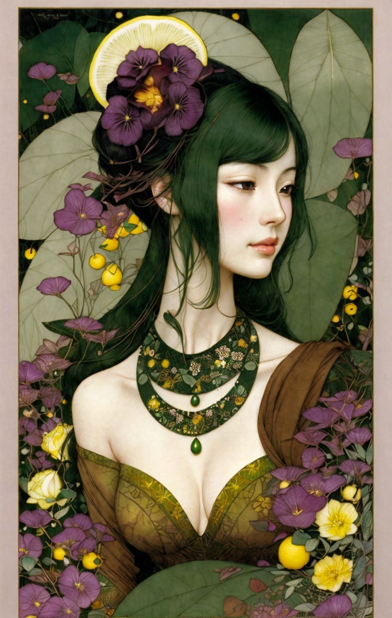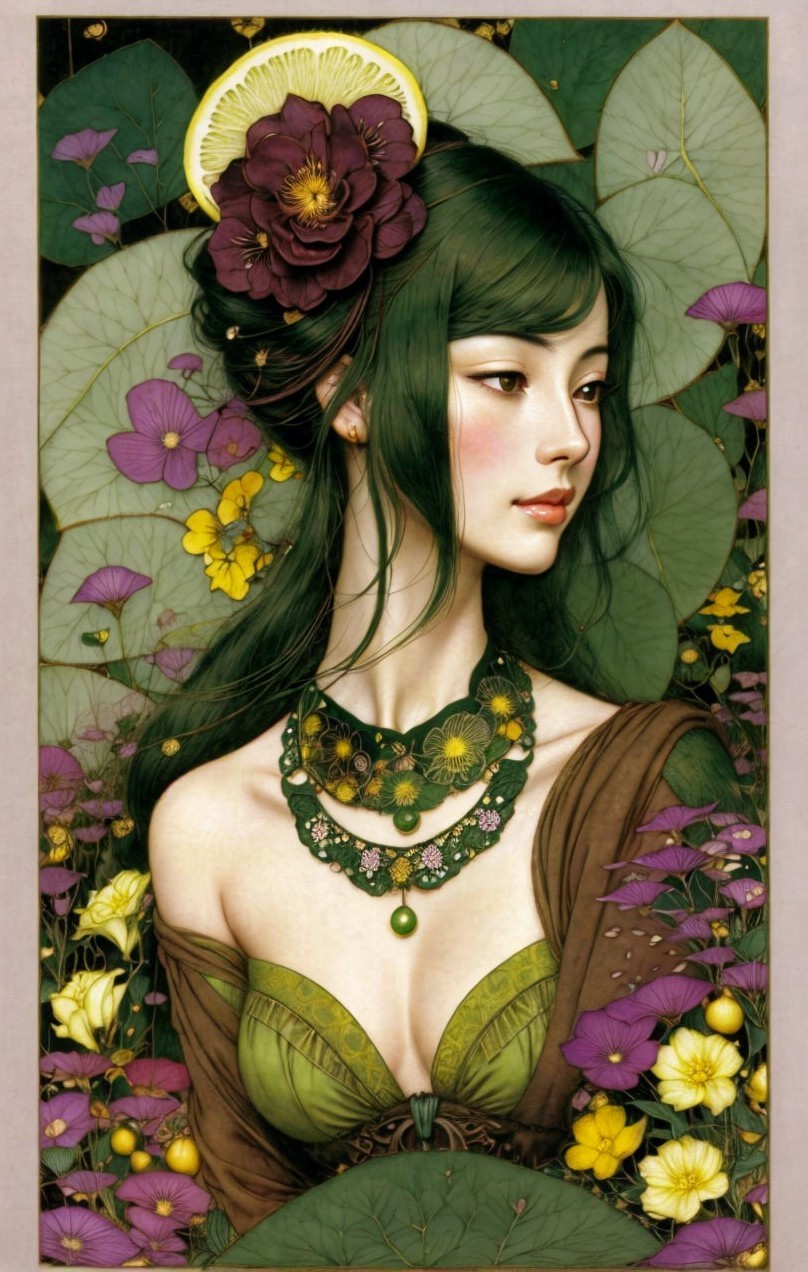 + Prompt:Beautiful woman. Deep brown, lemon yellow, olive green, grass green She Beauty is upon you like the dew on grass each morn. Why are you so sad