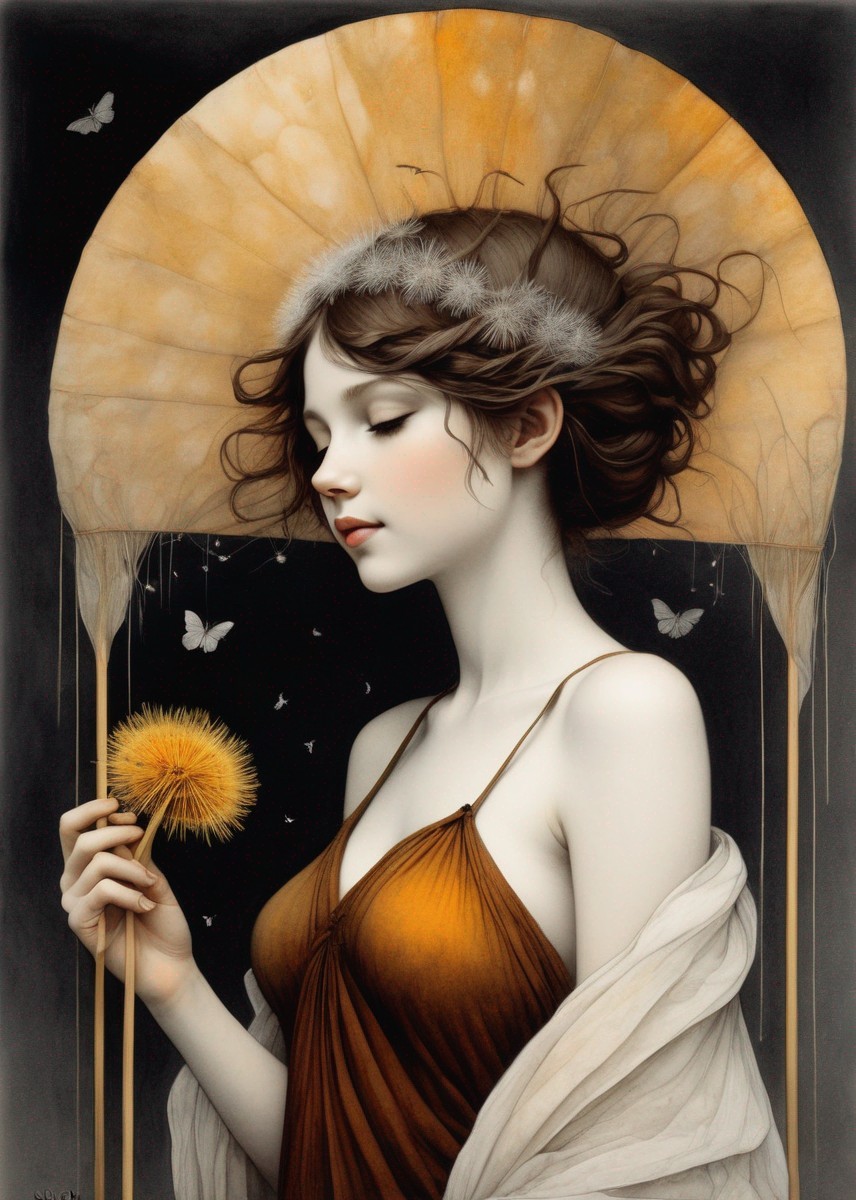 A young girl with a serene expression, holding a dandelion, is framed by a halo of dandelion heads against a dark background.