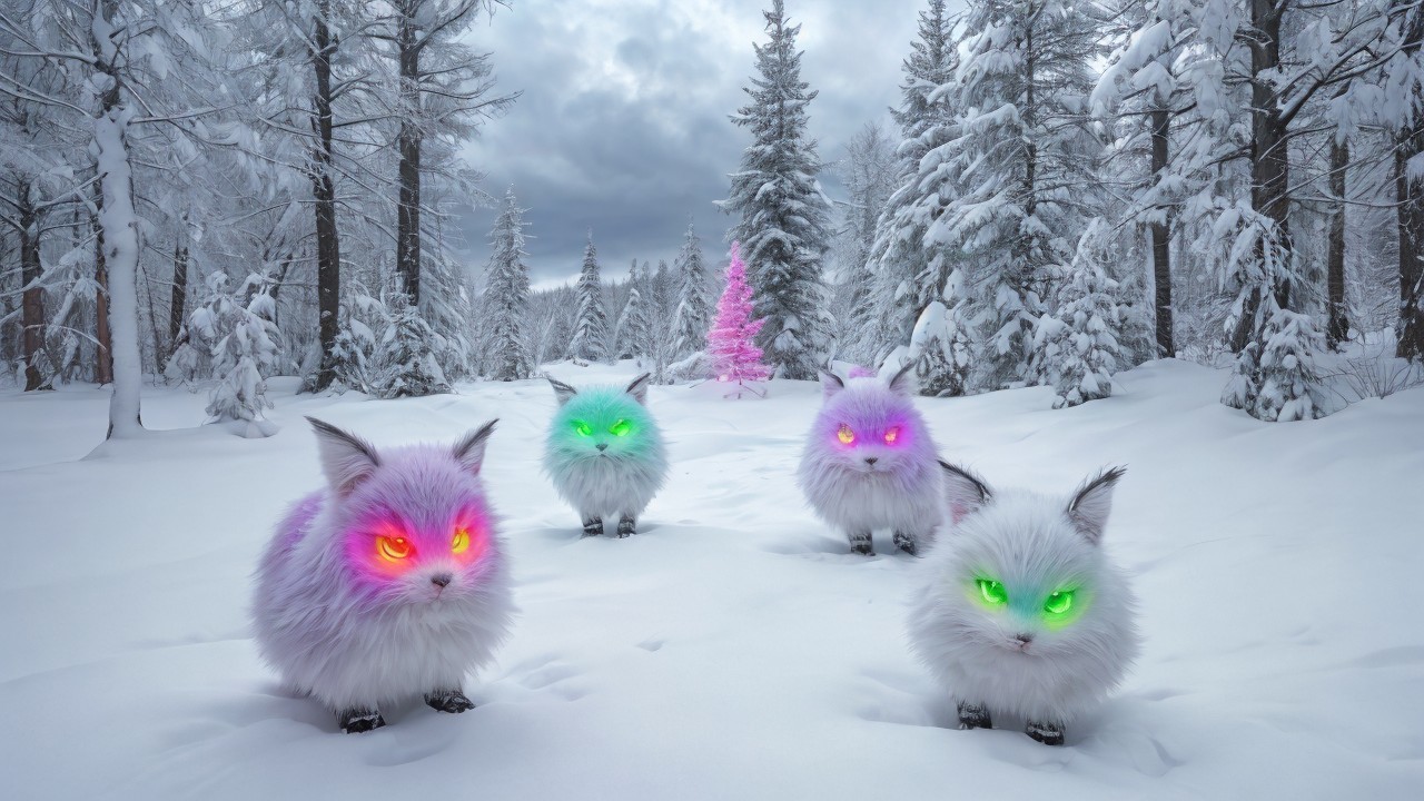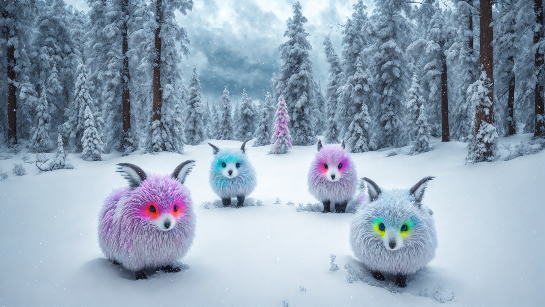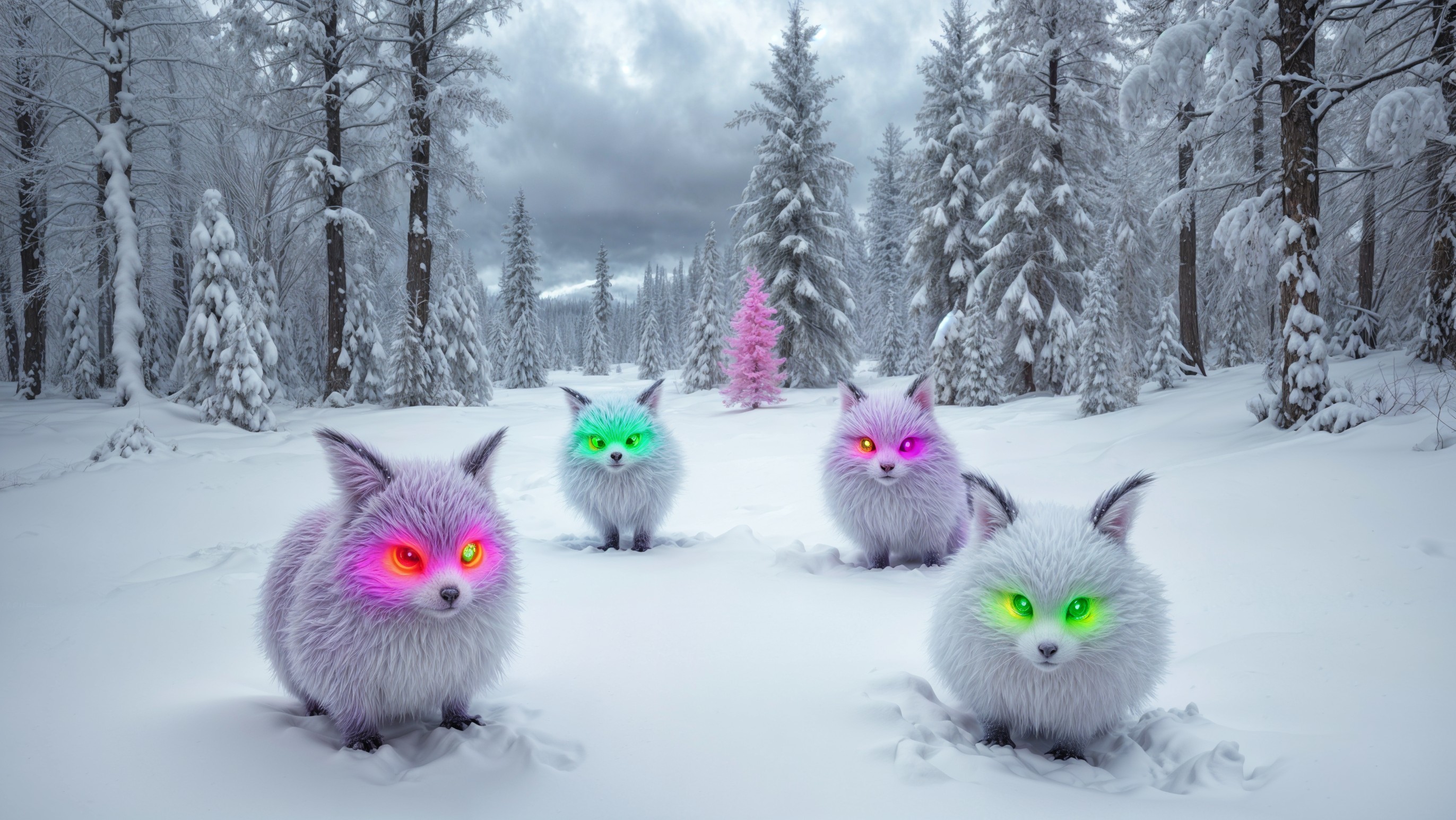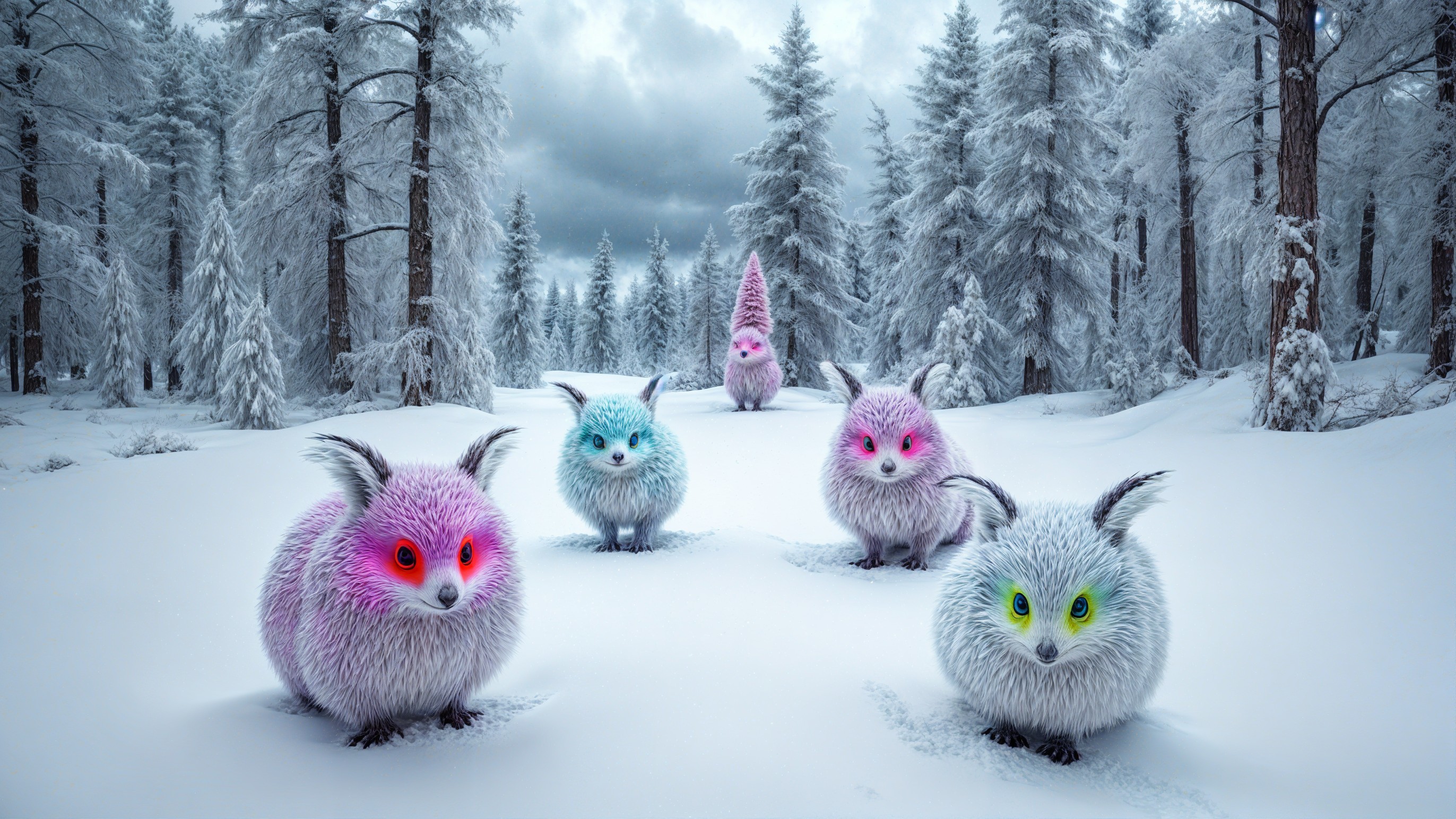 Prompt: "fluffy little forest creatures, whimsical gothic elements, vibrant hues; optical glitch anomalies, data bending; enchanting winter landscape with soft snow, pastel skies; emulsion lifts, wrapped in aluminum-latex; high definition, 3D shading, incredible artistry, hyper-real sharpness; cinematic film still, color graded, film grain, v-raptor XL, 35mm film, light and depth, 8k resolution, detailed composition"