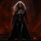 A woman in a sleek black leather coat stands confidently in a dark, volcanic landscape. Fiery lava glows in the background, with jagged rocks and steep steps leading into the ominous terrain.