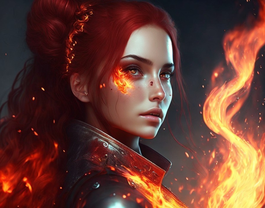 Digital artwork of woman with striking eyes, red headscarf, golden earrings, glowing skin, near