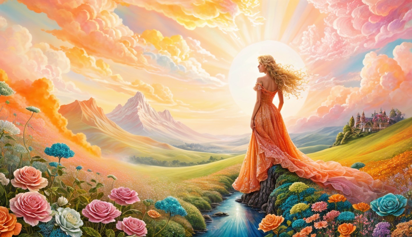 A figure in a flowing orange gown stands amid vibrant clouds and rolling hills, with colorful roses in the foreground and a radiant sun rising in the background, creating a dreamy atmosphere.