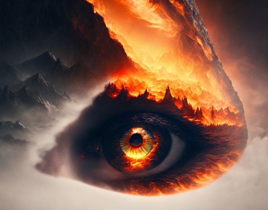A surreal image showing figures on a rocky outcrop with a giant fiery eye underneath in a volcanic landscape.