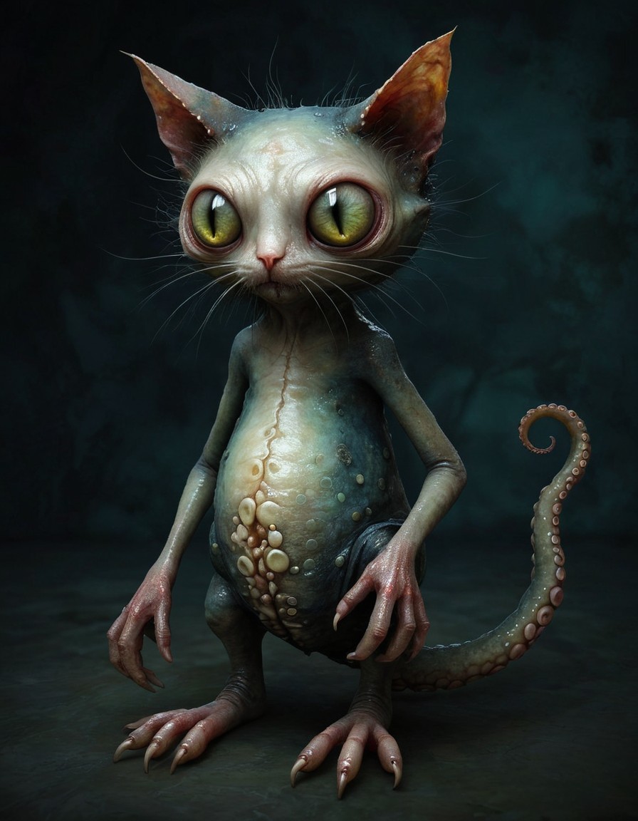 Prompt: Iillogically chopped patchworked ragdolled innsmouth conjoined cat_toid_cephalopod different optical elements 5 dimensional representation of {Simon Bisley art style depicted in Genndy Tartakovsky's Masterpiece cartoonish style by Eric Lacombe & by Endre Penovac & by Basil Gogos & Aron Wiesenfeld} : Art (from Terrifier franchise) hat appear to be two billion years old, by Basil Wolverton and by Gerald Scarfe : FAKE HAPPYMESSS HAPPINESSS