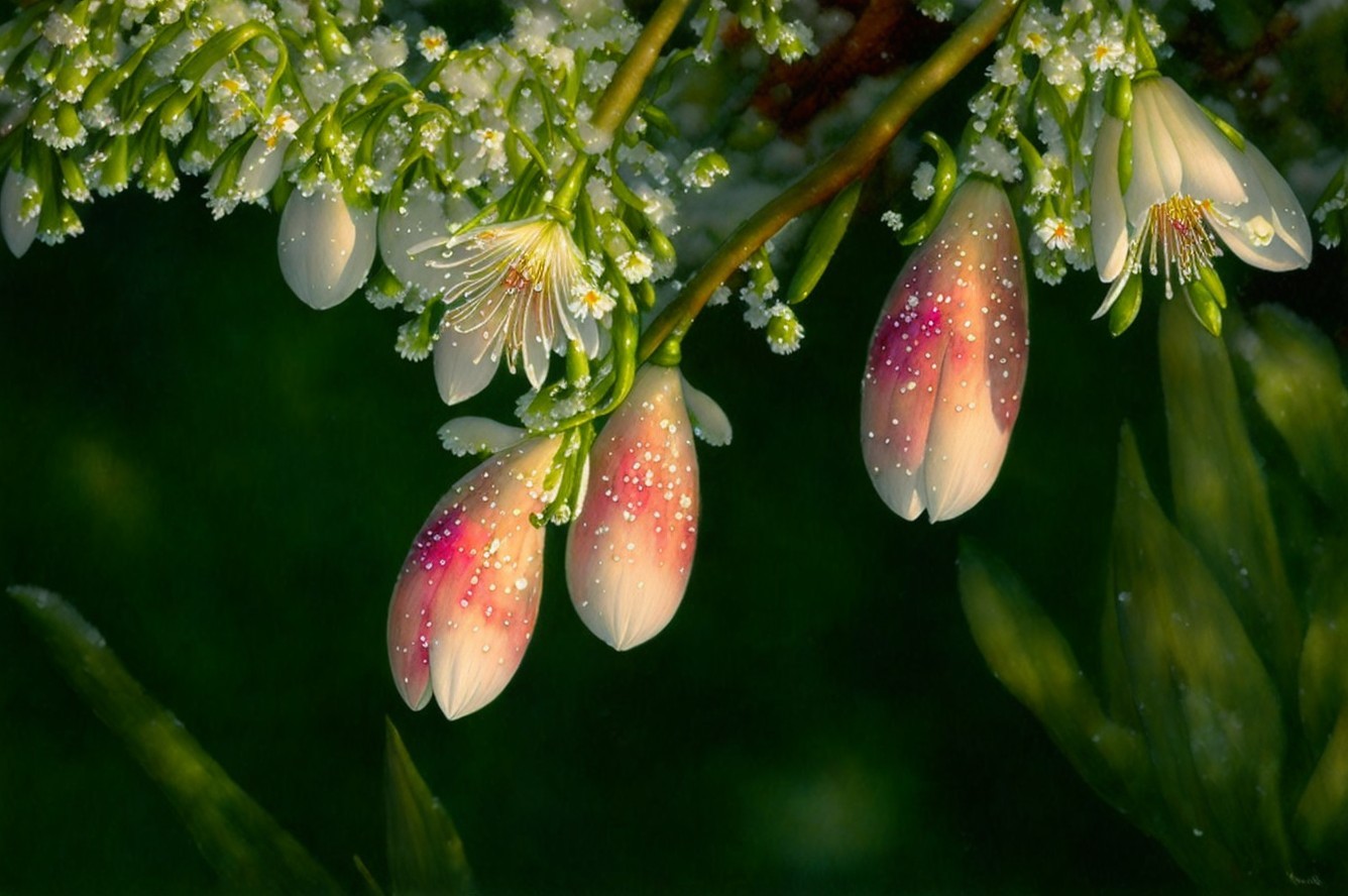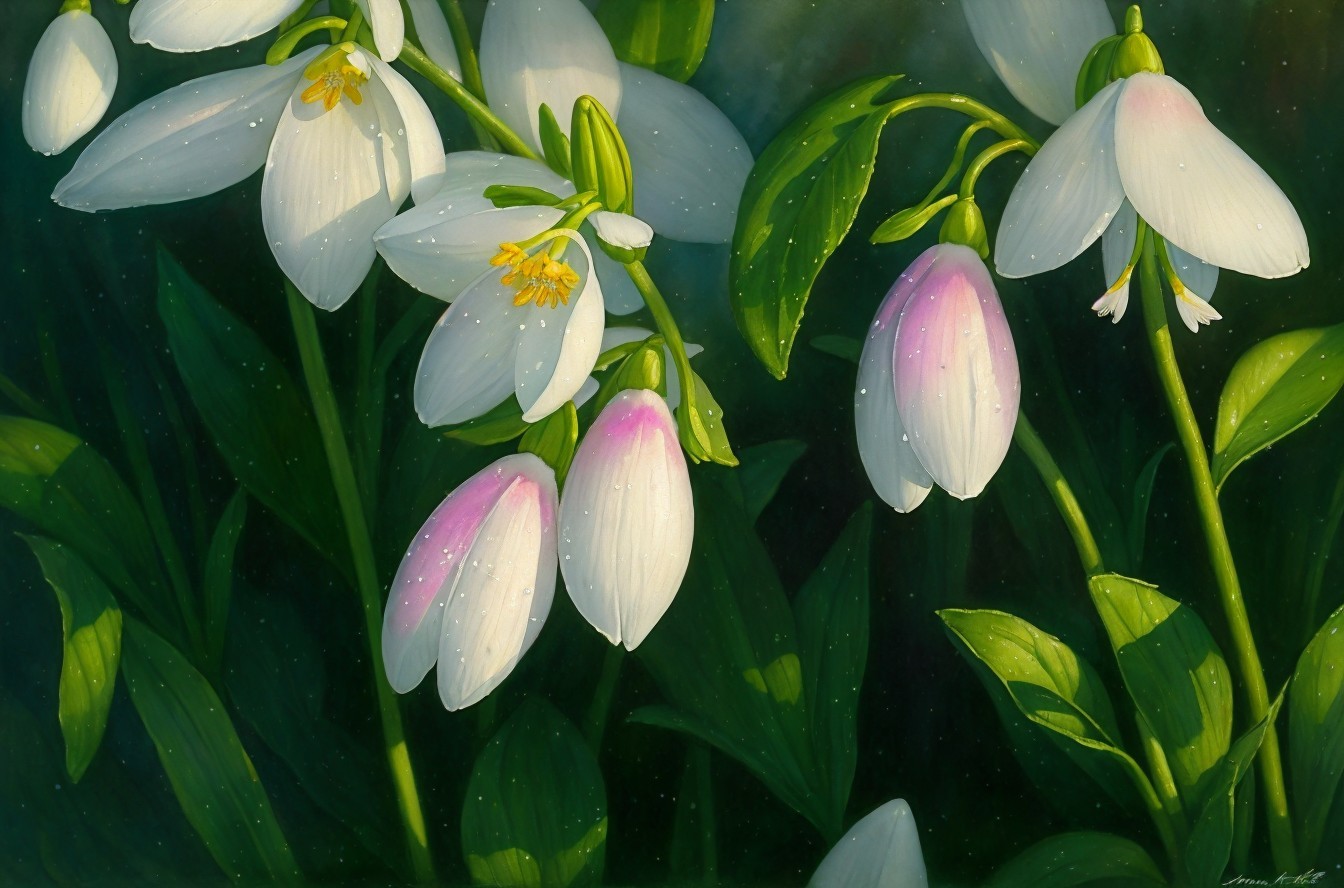 Snowdrop Flowers and Green Leaves in Falling Snowflakes