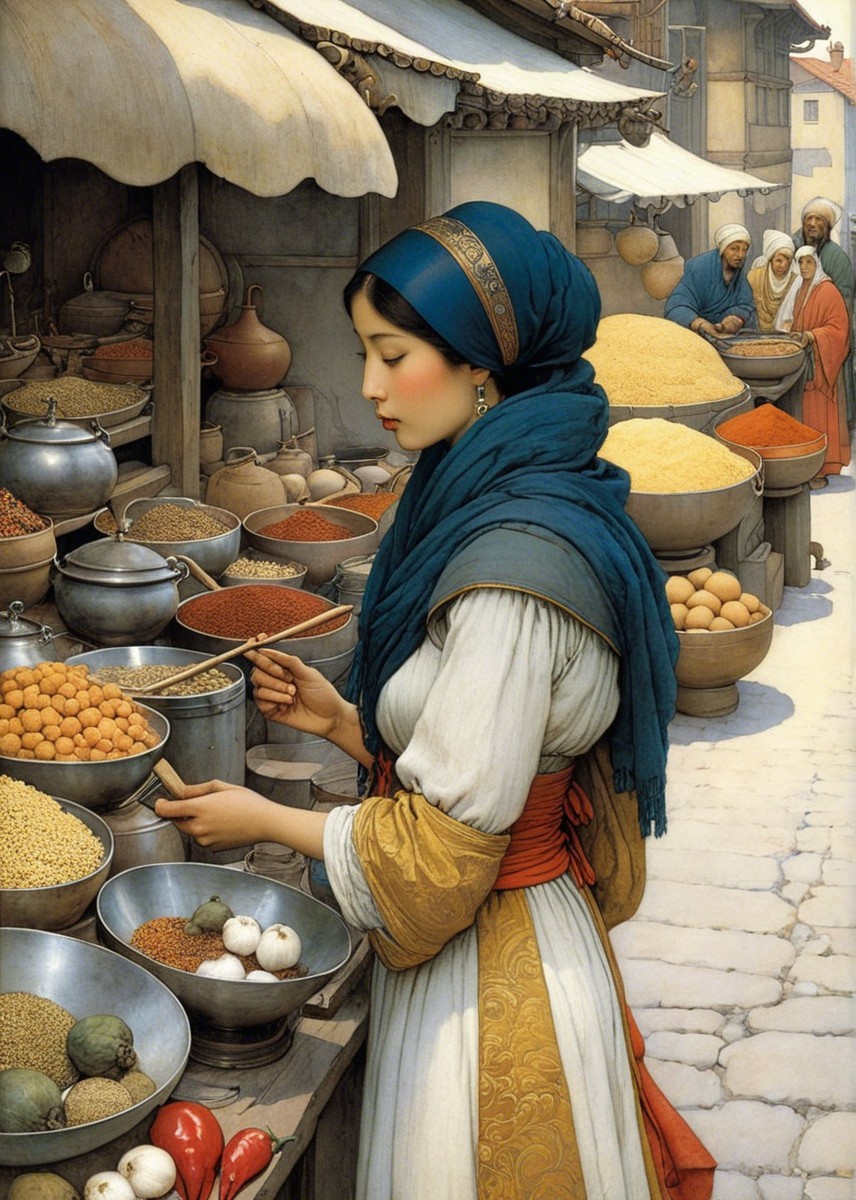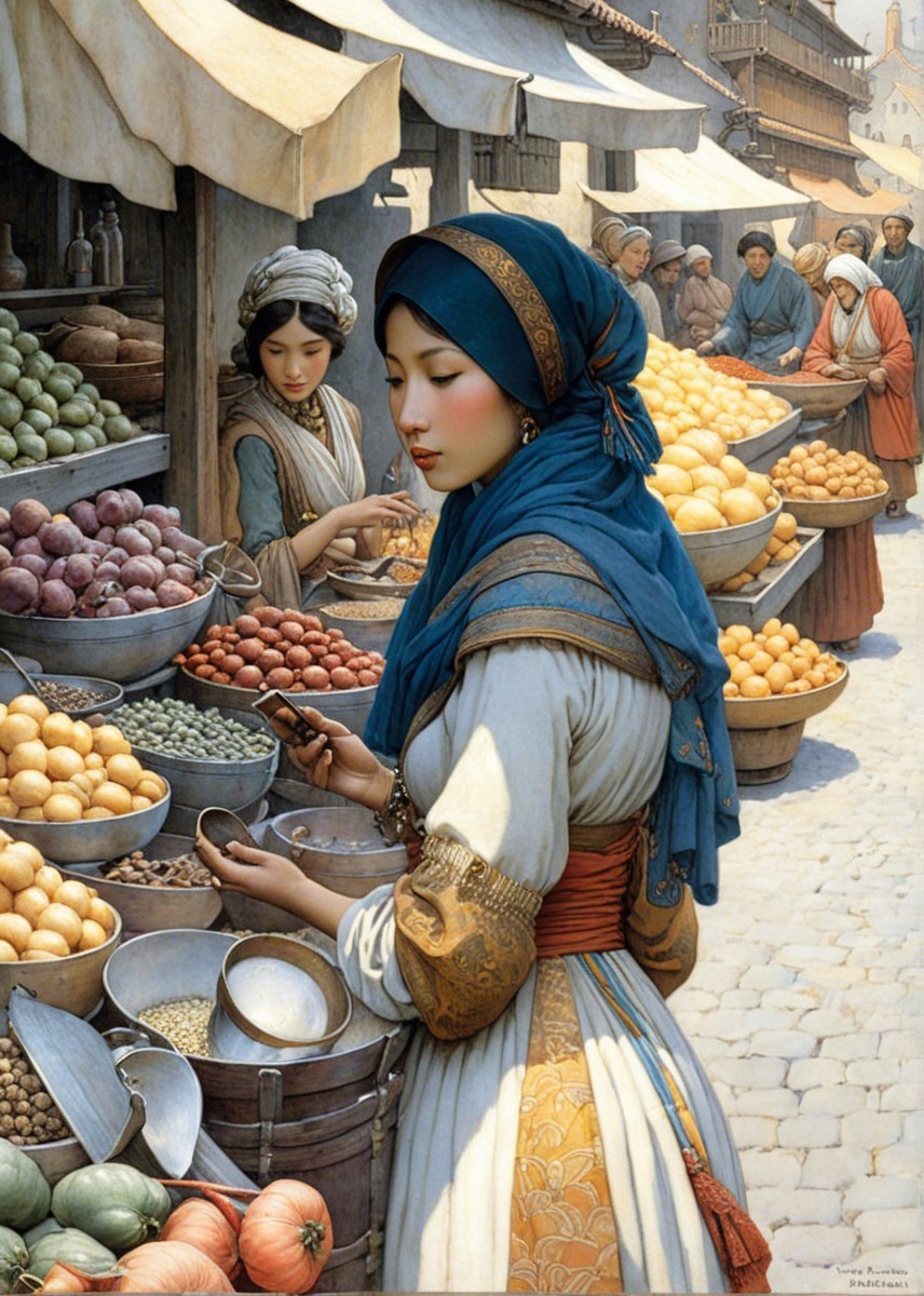 A stunning illustration of a woman with vibrant blue curly hair, surrounded by lush yellow and soft pink flowers. She gazes calmly, embodying beauty and nature intertwined in an elegant design.