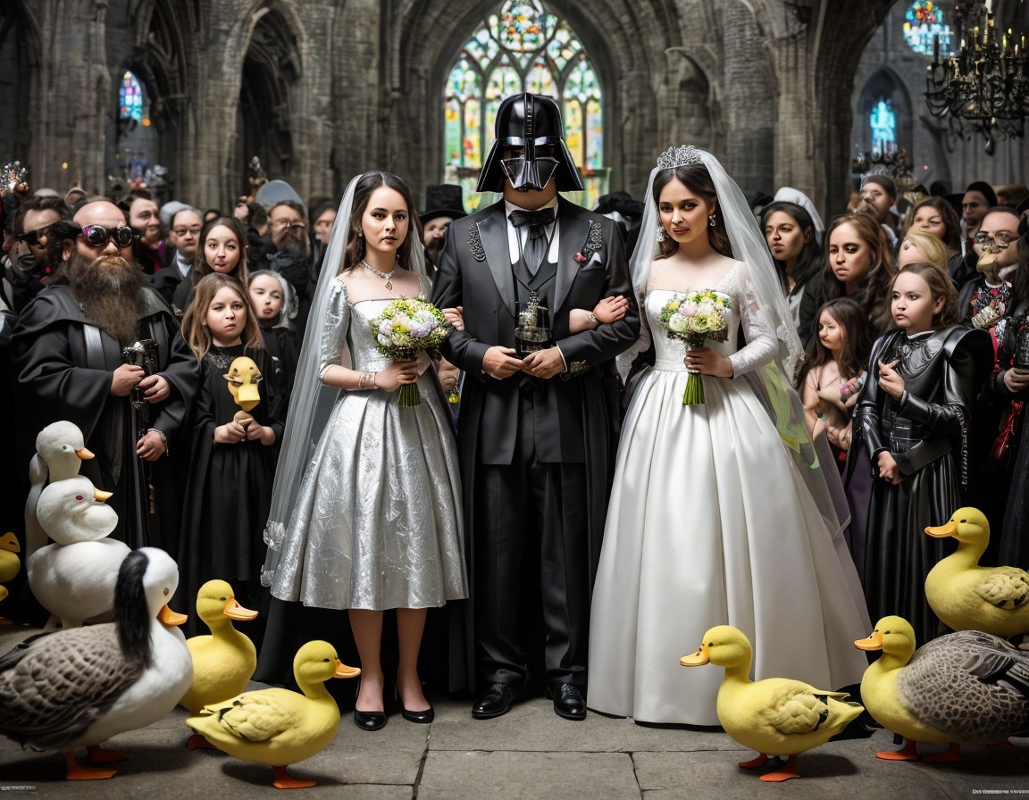 A wedding scene with a Darth Vader groom, two brides, guests in dark attire, and ducks in the foreground inside a gothic church.