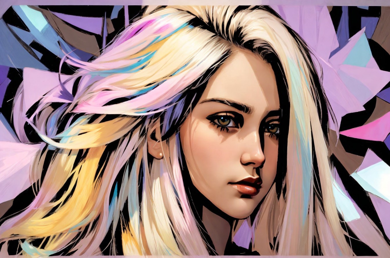 STYLIZED illustration, stylized portrait of teenage woman with crystalline hair, triadic color scheme blue beige black, Stylized Portraiture, woodblock print 1.7, dynamic lighting 1.7, triadic anisotropic filtering 1.7, raytraced shadows 1.2, strict, hazy, eerie, spiritual essence, encaustic strokes, fine lines 1.7, psychedelic, stylized illustration 1.5, dethereal, tints of Margaret Keane and Marsden Hartley, very detailed illustration, plasticity 1.6, radiance, brightness 1.9, ambient occlusion 1.9, custom_loss: grey, divine, enlighted, synthetic, occult, american gothic 1.9, dimmed ornamental background, beautiful detailed nose, realistic devilish eyes, dynamic lighting 1.7, gouache paint , grunge, High coloring, detailed close-up portrait, stylized face, soft edges, back-lit, triadic color scheme blue red white, dynamic lighting, dry brushed paint, ambient occlusion 1.5, shadow mapping 1.3, 3d effects 1.8, intricate stylized hairstyle, brightness 1.7, stylized , abstract, coherent, hues, radiance, brightness 1.4, silver particles, dreamy glow, tints of abstract art 3d effects 1.8, shadow mapping 1.3, dynamic lighting 1.7, ambient occlusion 1.5, raytraced shadows, ethereal, otherworldly, abstract style 1.7, hues, grain, blurry aura, fantasy movie still, synthetic essence, raytraced shadows, dark fantasy art, mist, mystical symbolism, golden ratio, coherent, fauvistic, wavery ink, grainish inkpunk,