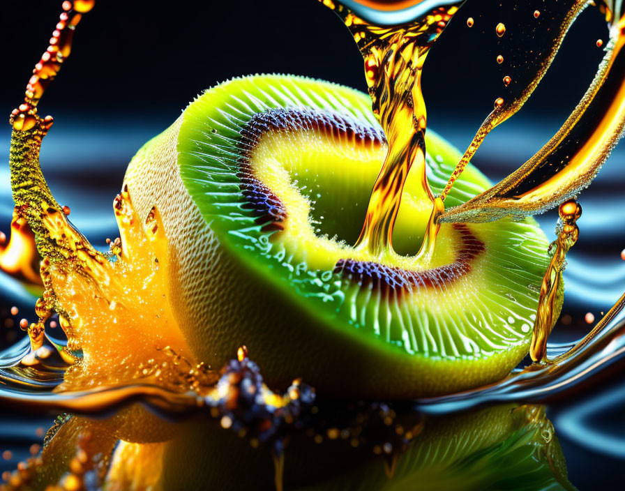 Freshly sliced kiwi fruit with orange liquid on dark background