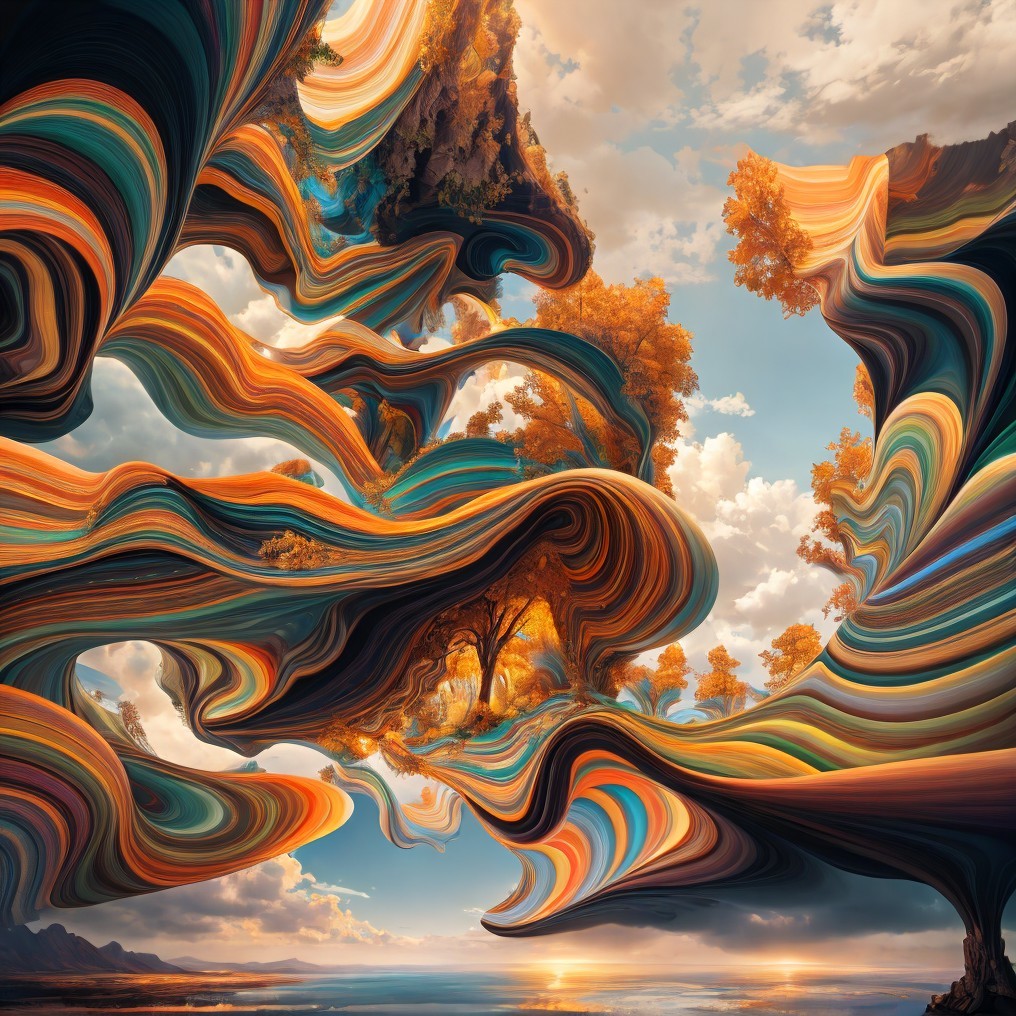 Fantastical landscape with rock formations, waterfall, autumn trees, and cliffside house.