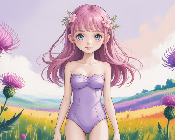 A charming anime girl dons a playful dinosaur-themed swimsuit, featuring vibrant colors and whimsical patterns. Her cheerful expression and lively pose capture a fun, adventurous spirit perfect for summer.