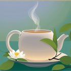 A serene illustration of a steaming white teapot resting on a saucer, accompanied by delicate green leaves and a white flower, set against a smooth gradient background.